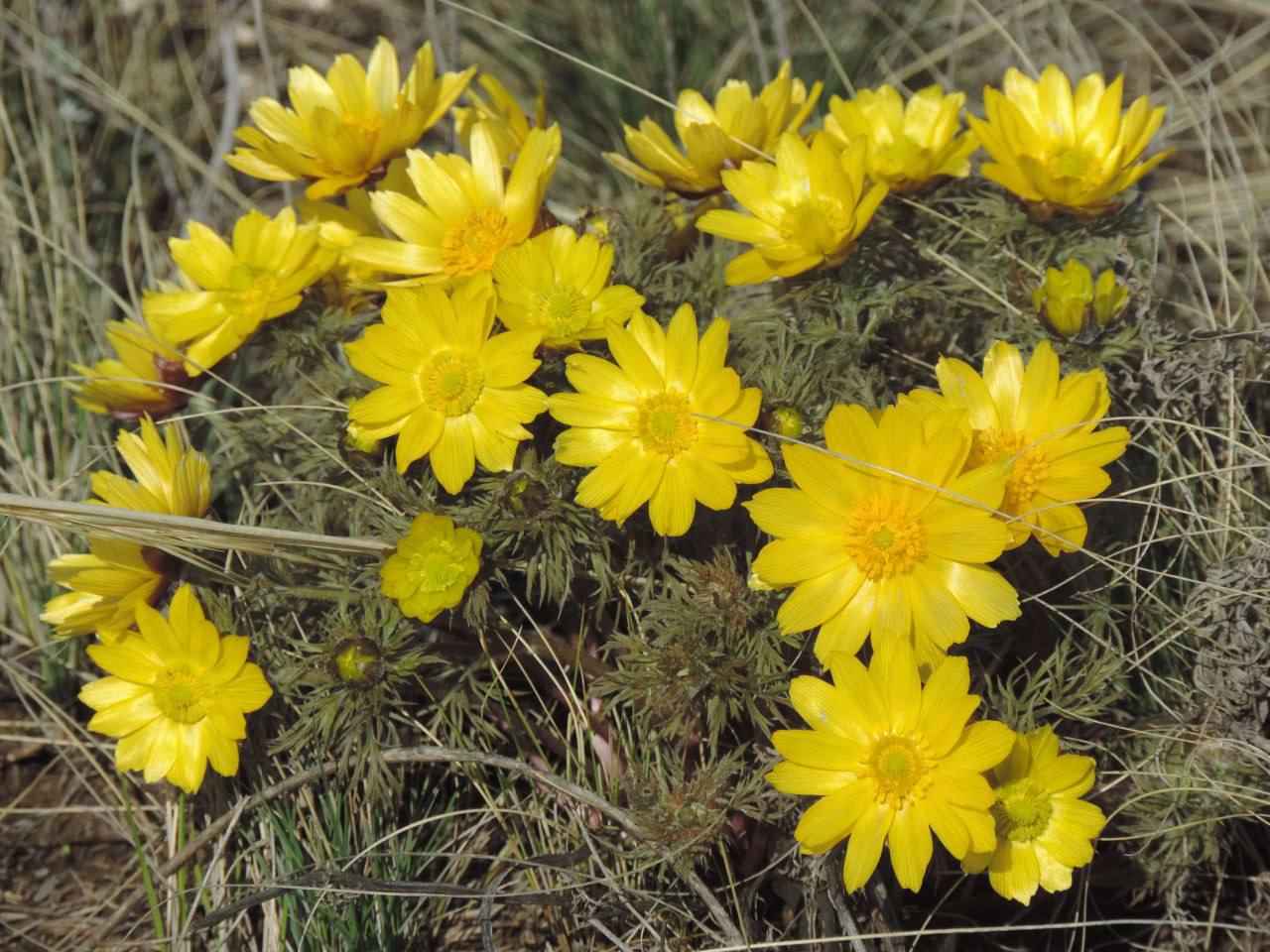Степь просыпается — и это видно невооружённым глазом. Горицвет в деле. Адонис яркими жёлтыми пятнами пробивается сквозь прошлогоднюю траву.