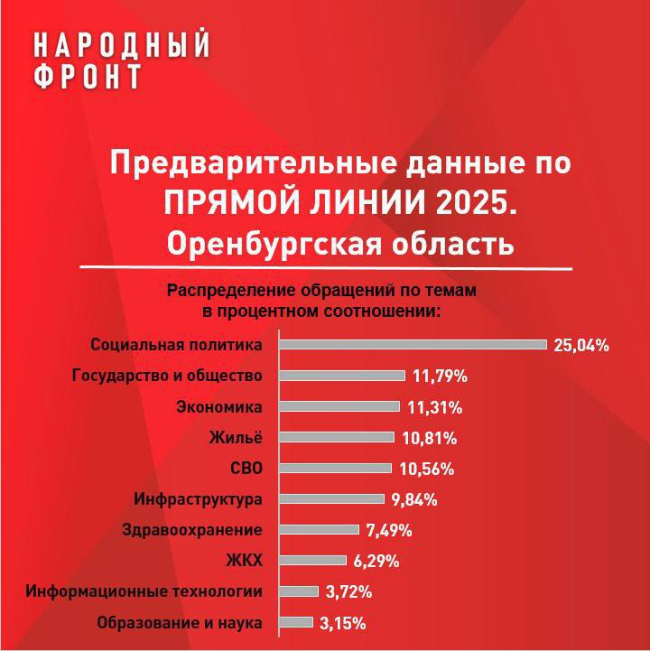 В Топ-3 тем наиболее волновавших жителей Оренбуржья вошли: социальная политика (25,04%), государство и общество (11,79;) и экономика (11,31%).