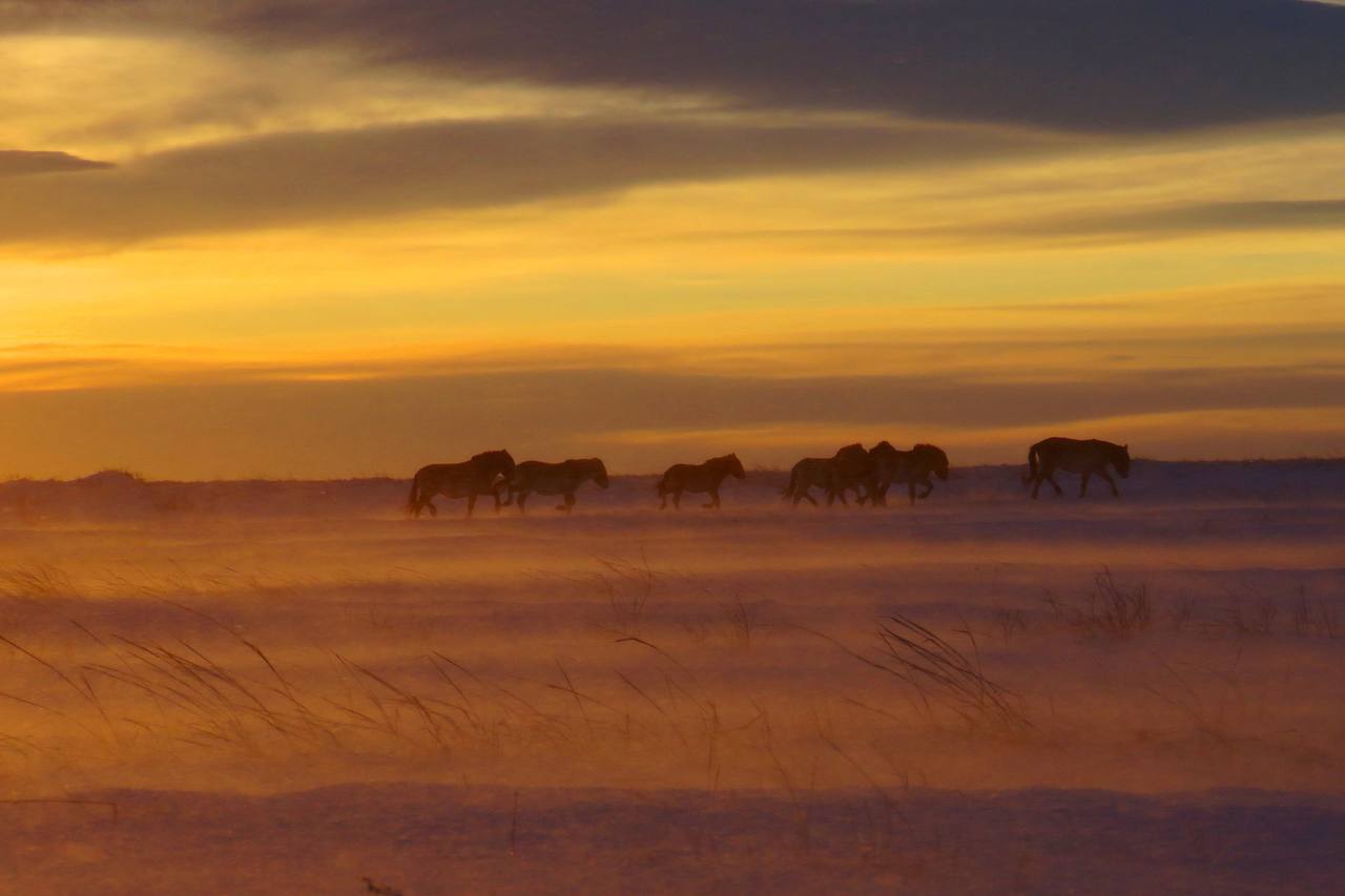 Несмотря на непогоду, госинспекторы заповедника на снегоходах навещали табуны. Лошади чувствовали себя неплохо, разгребали твёрдый наст в поисках корма. Паслись они в низинах, где ветер был слабее.