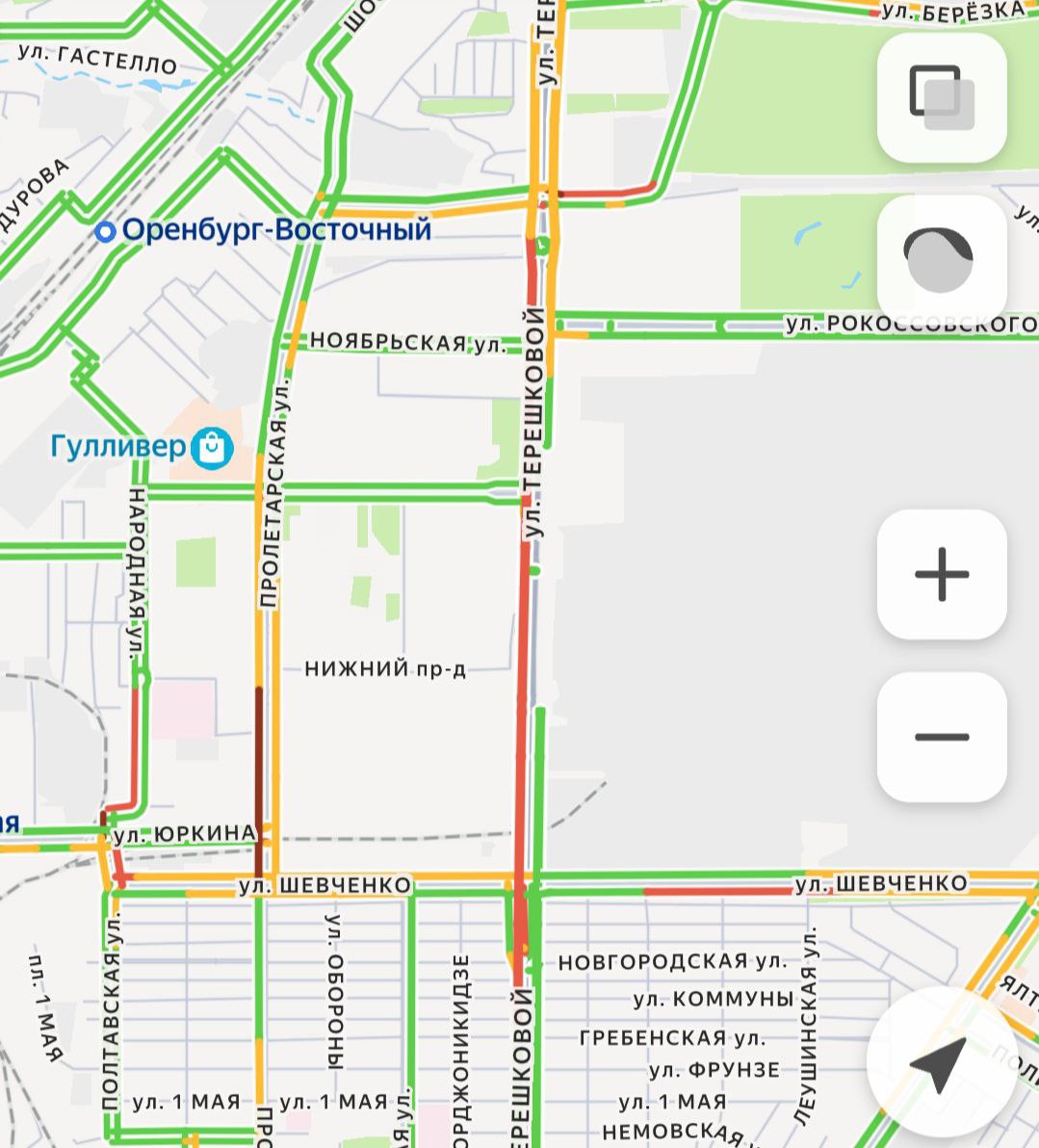 -Ул. Терешковой: плотный затор от ул. Хабаровской в сторону центра. Потеряете минимум 15–20 минут. И там тоже произошло ДТП у «Салюта» — перевернулась легковушка — на фото.