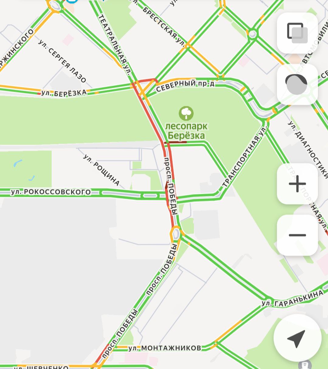 -Пр. Победы: затруднено движение в районе медуниверситета и на перекрестке с ул. Степана Разина.