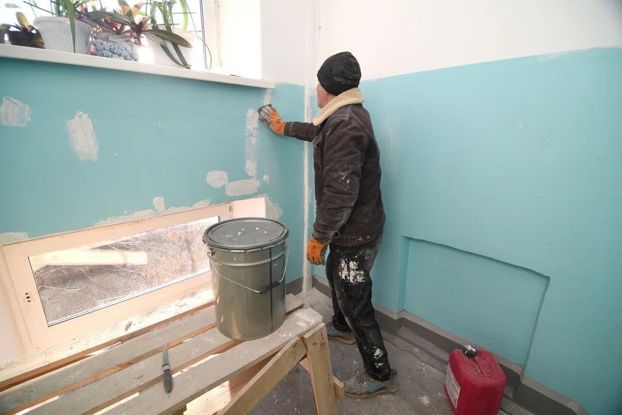 Выгоревшая часть фасада отремонтирована. Начато нанесение штукатурки. А в подъездах проводят косметический ремонт.