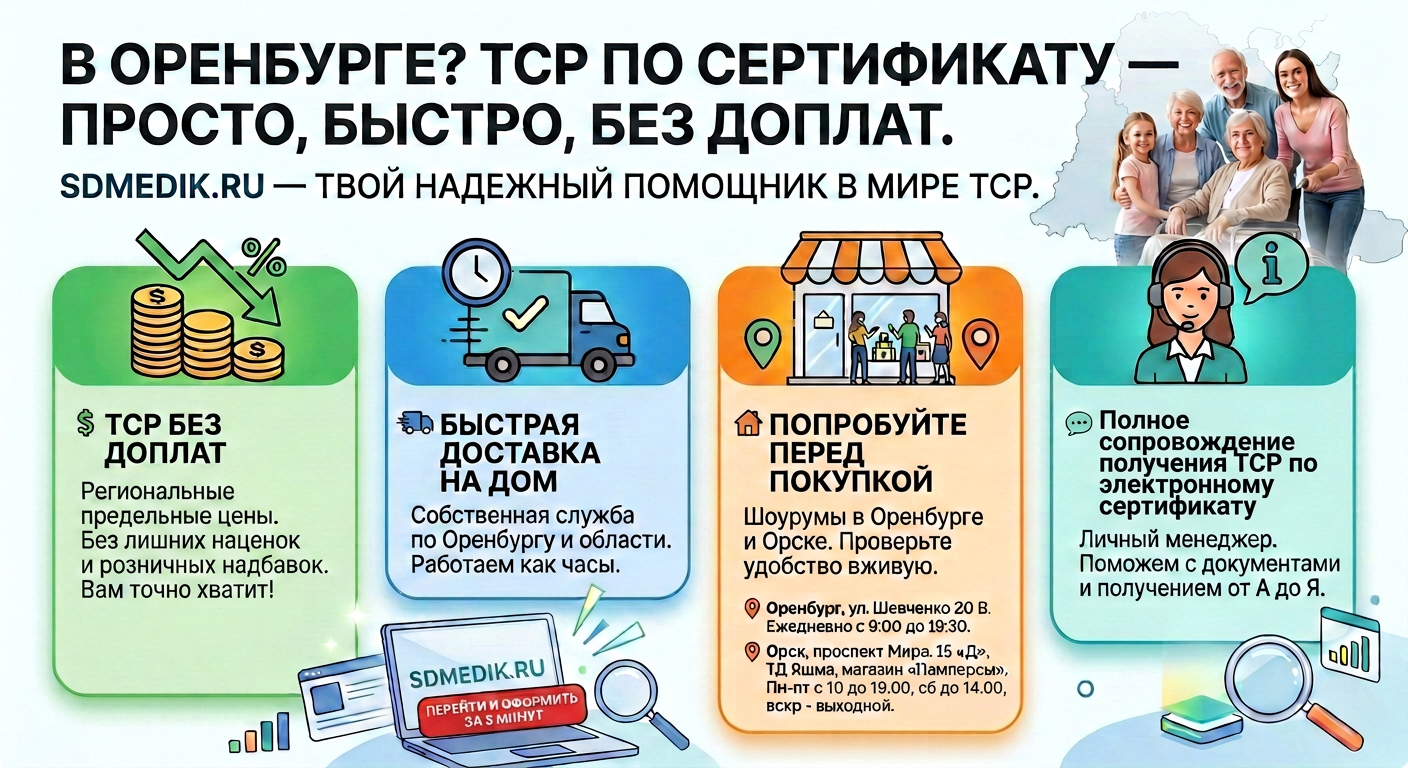 И вот здесь у оренбуржцев есть серьёзное преимущество. Потому что есть sdmedik.ru — и для жителей Оренбургской области это, пожалуй, самый удобный, выгодный и понятный способ приобрести ТСР по электронному сертификату.