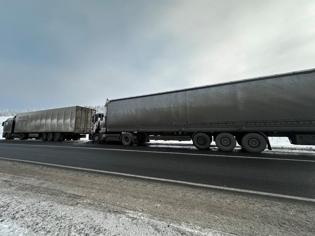 На зимней дороге среди бела дня столкнулись две фуры — «Ситрак» и «Скания».