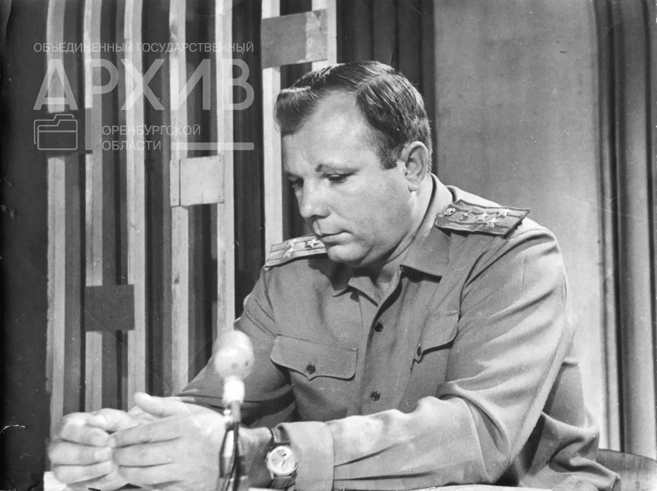 А это уже последний приезд в Оренбург. Август 1967 года. 33-летний полковник ВВС, еще слушатель военно-воздушной инженерной Академии имени Жуковского — Юрий Гагарин. Видно уже, что перед нами не просто старший офицер, а государственный деятель. Напомним, что Гагарин в то время уже был одним из руководителей Центра подготовки космонавтов СССР.