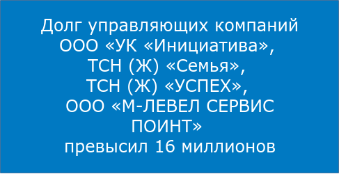 Общая сумма долга управляющих компаний Оренбургской области за поставленный газ для крышных котельных многоквартирных домов на сегодняшний день превышает 16 млн рублей. В число организаций, систематически не исполняющих свои платежные обязательства по договорам, входят: ООО «УК «Инициатива», ТСН (Ж) «Семья», ТСН (Ж) «УСПЕХ», ООО «М-ЛЕВЕЛ СЕРВИС ПОИНТ».