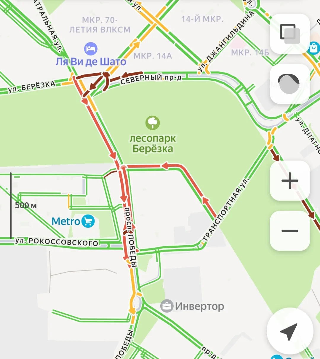-Проспект Победы: Движение сильно затруднено в районе «Полета» и на пересечении с ул. Маршала Жукова. Поток движется крайне медленно из-за высокой плотности транспорта.