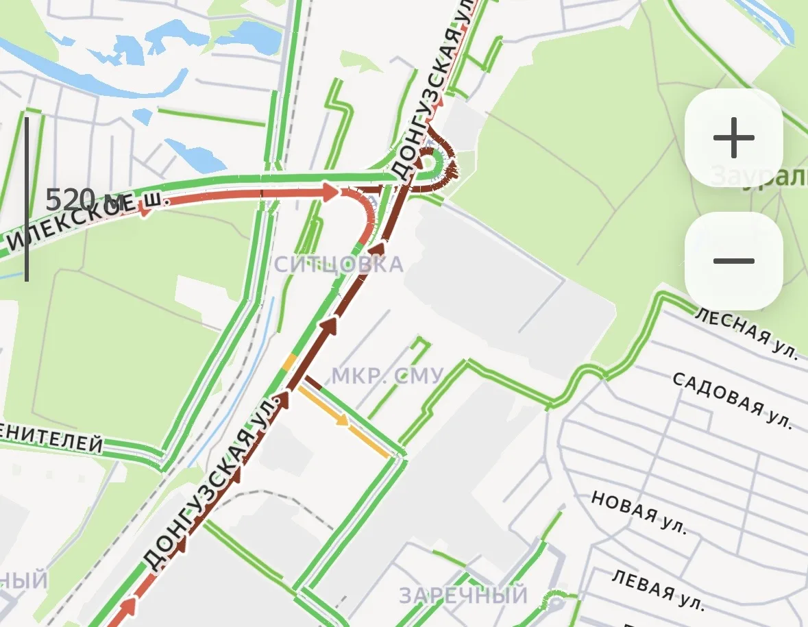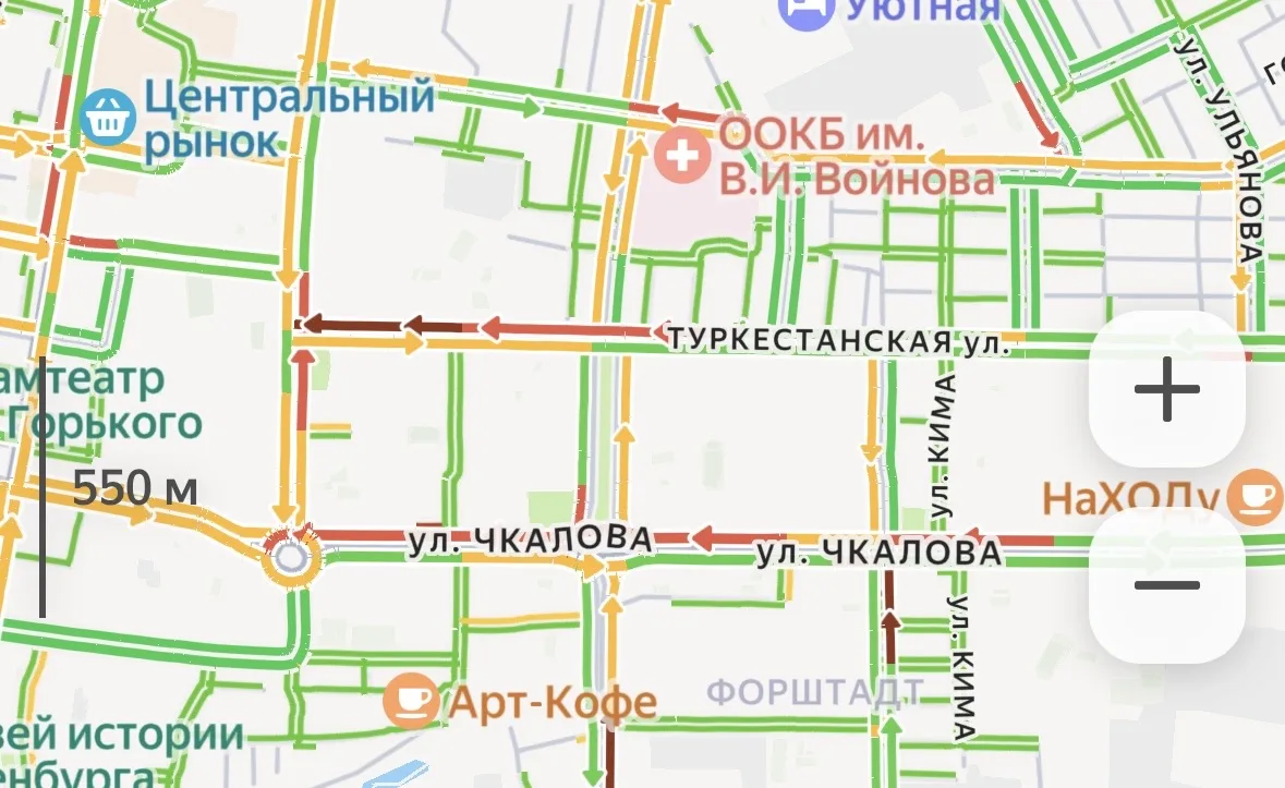 -Улица Чкалова: Движение сильно затруднено в сторону центра. Основной затор растянулся от ДКиС «Газовик» до пересечения с ул. Степана Разина