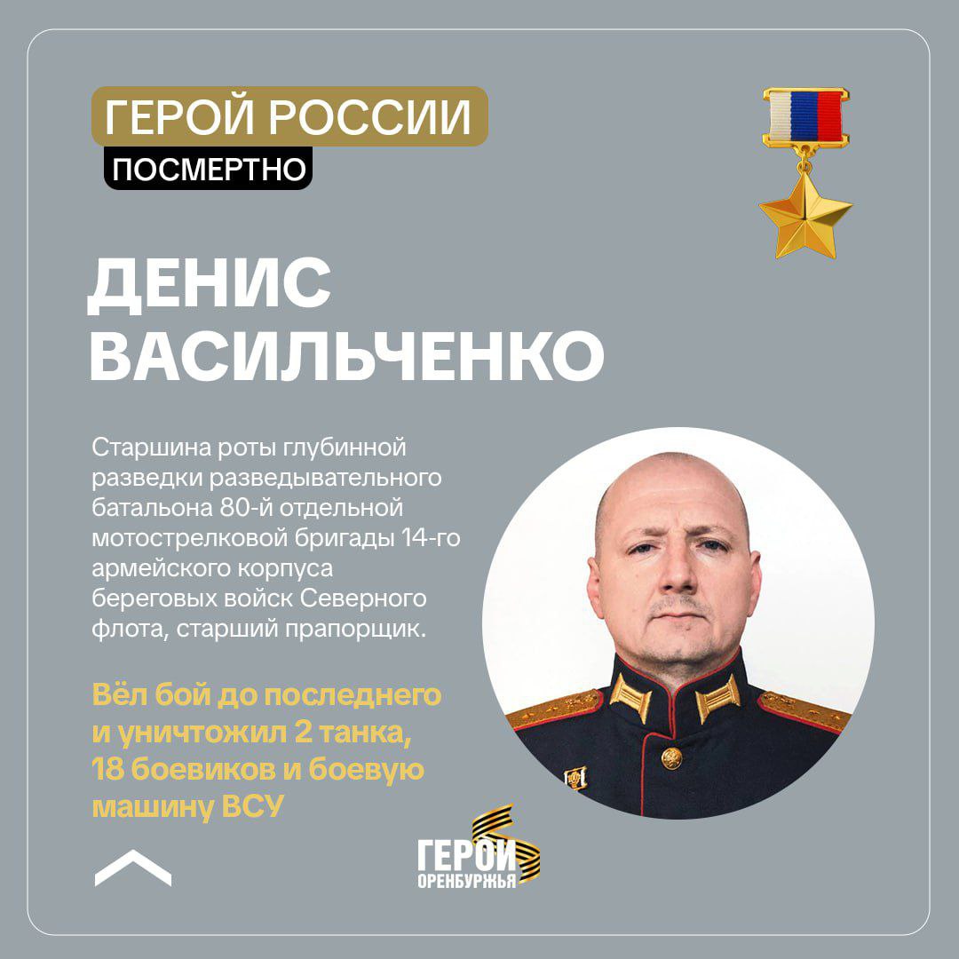 Денис Васильченко геройски погиб в октябре 2023 года. В своем последнем бою он в одиночку уничтожил два танка и 18 боевиков, успев подбить последнюю вражескую машину за мгновение до гибели. Звание Героя России оренбуржцу присвоено посмертно.