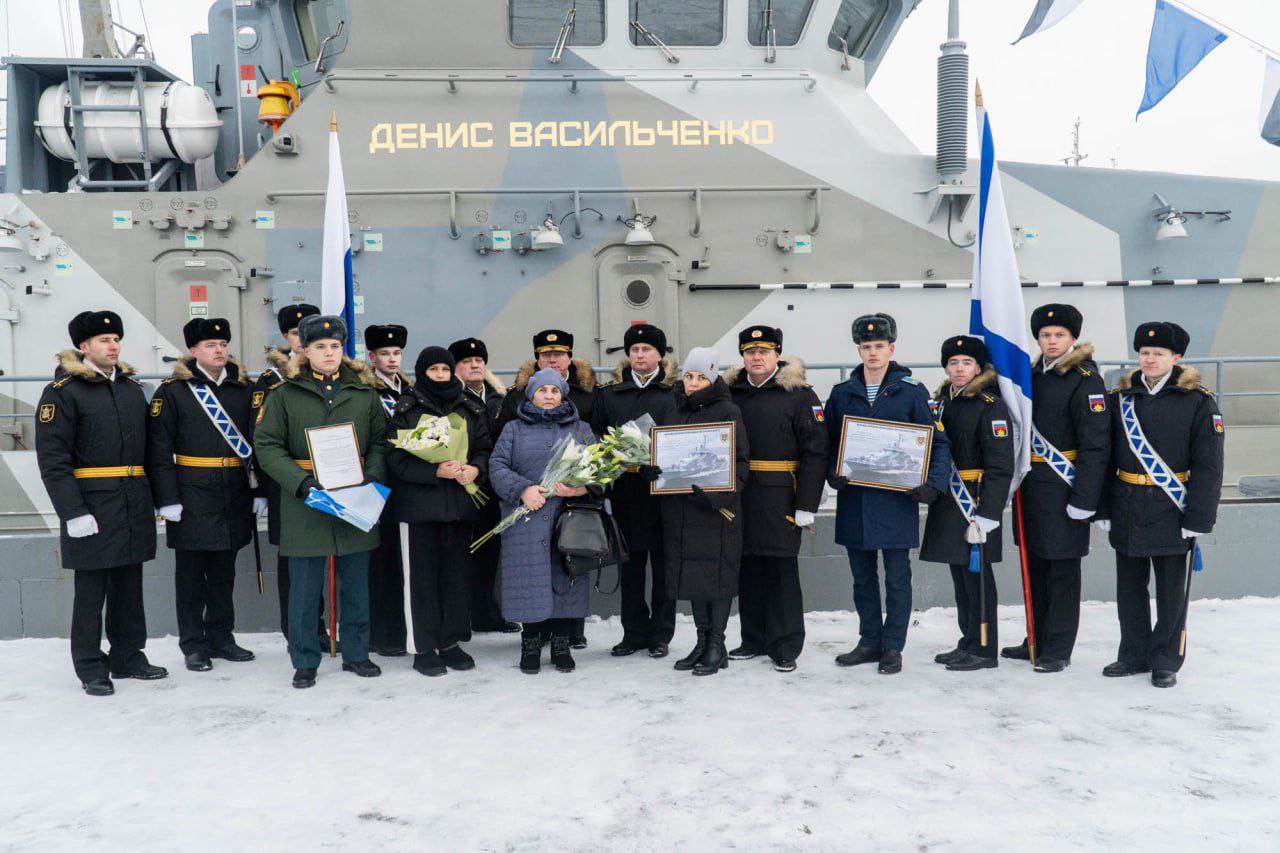 В торжественной церемонии приняли участие командование флота, сослуживцы и семья Героя. Вдове и сыновьям передали памятное фото корабля и флаг ВМФ.