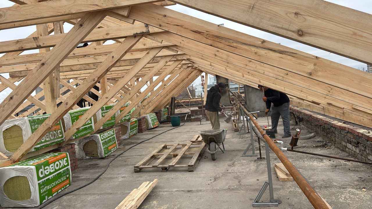 Вся сгоревшая кровля уже демонтирована. Заканчивается восстановление кирпичной кладки, установлены новые деревянные балки. Они обработаны специальным огнезащитным составом.