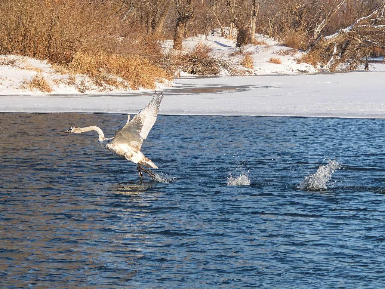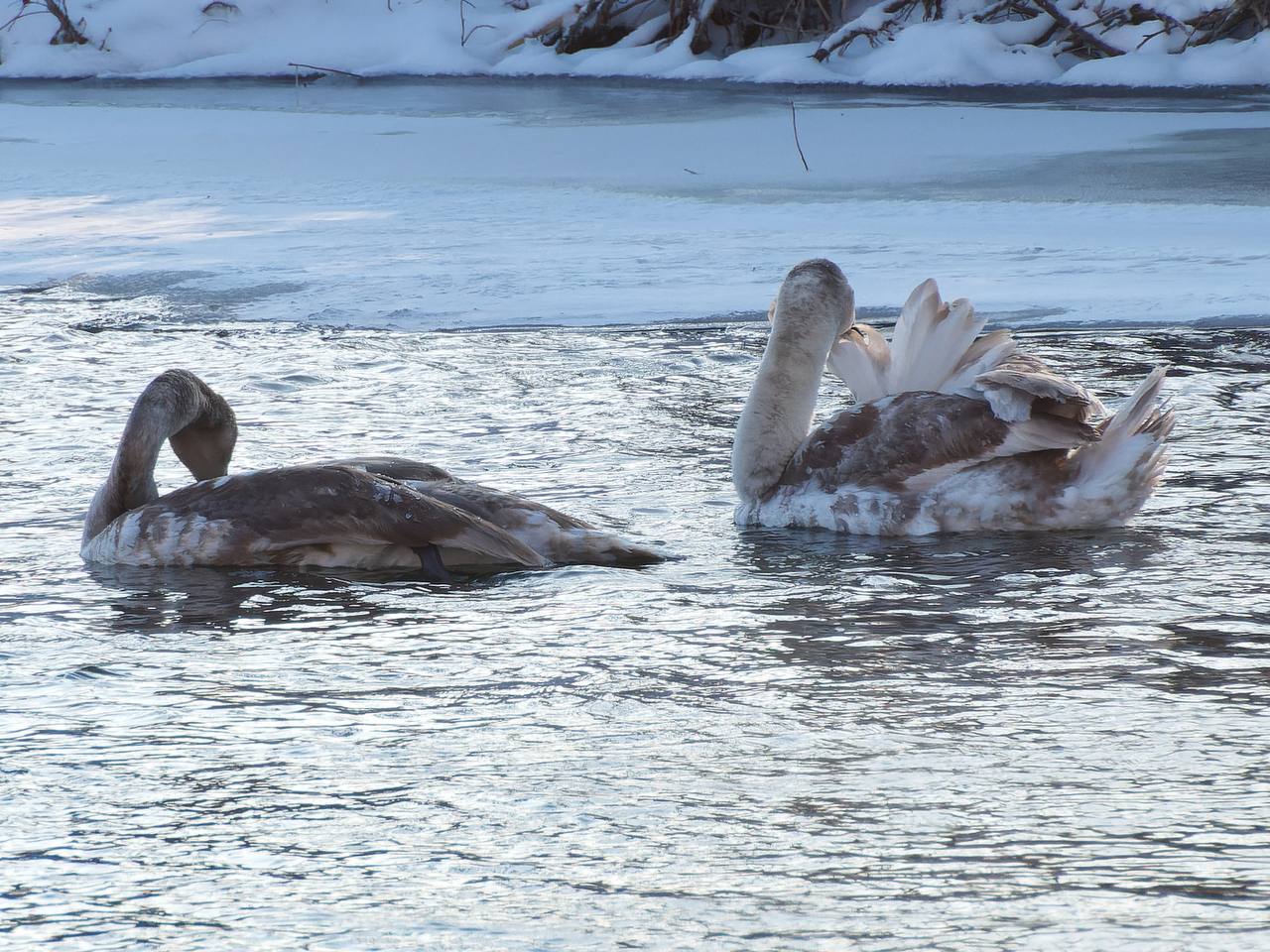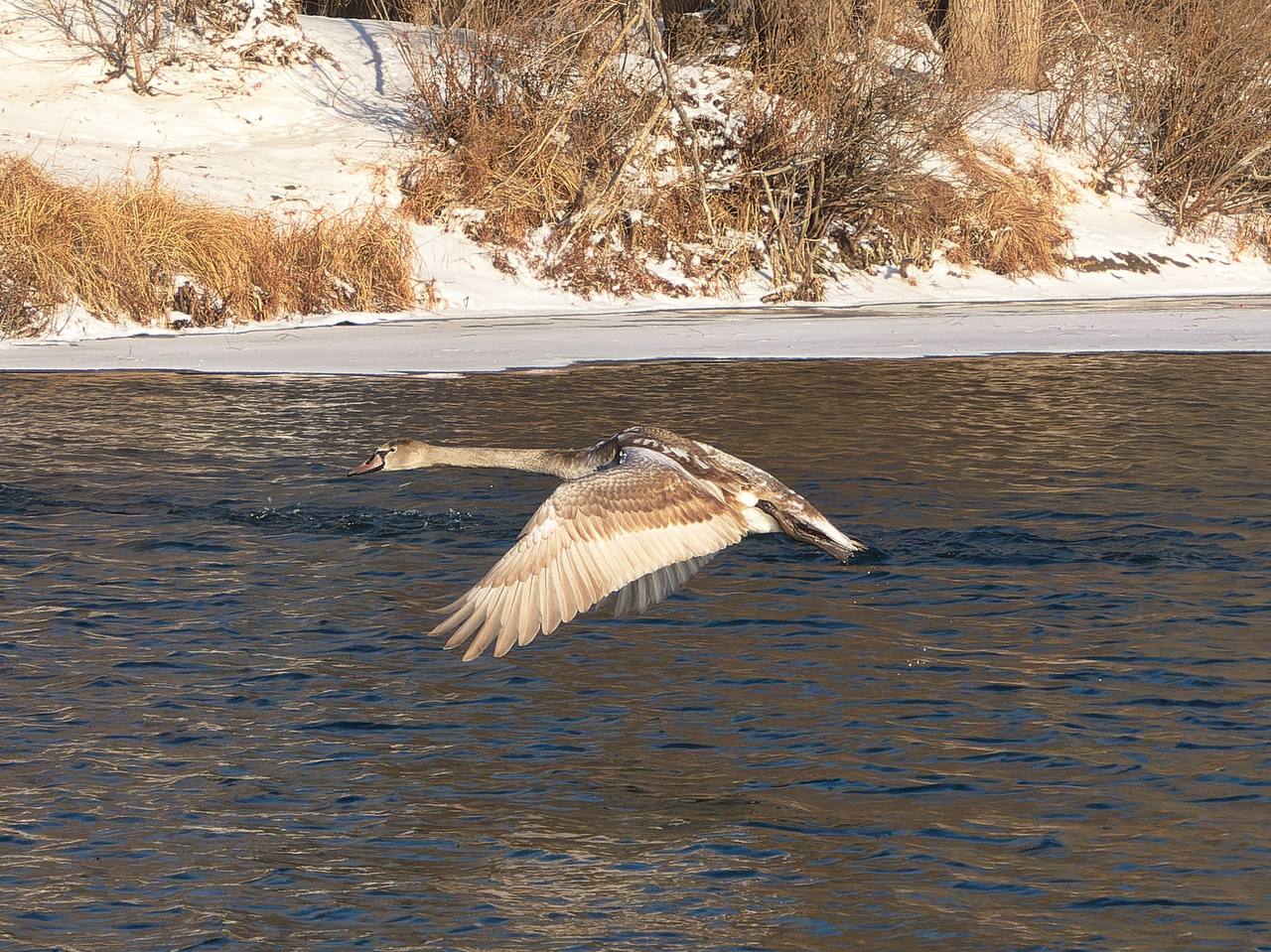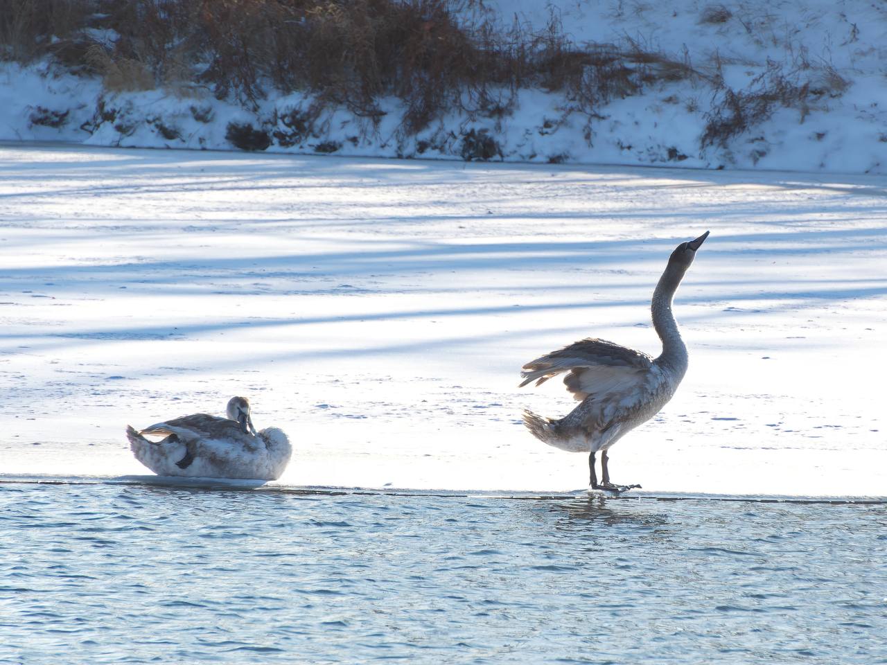 Грациозные пернатые выбрали для зимовки участок реки Урал, который пока не сковал лёд.