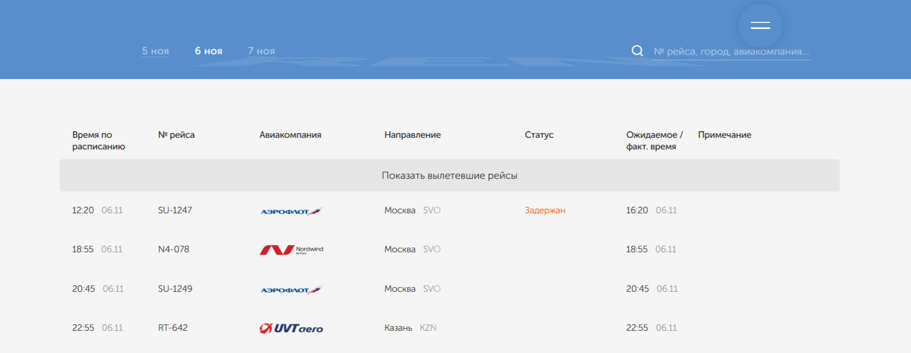 Вылет рейса №SU1247 обратно в Москву планировался в 12:20, он перенесен на 16:20.