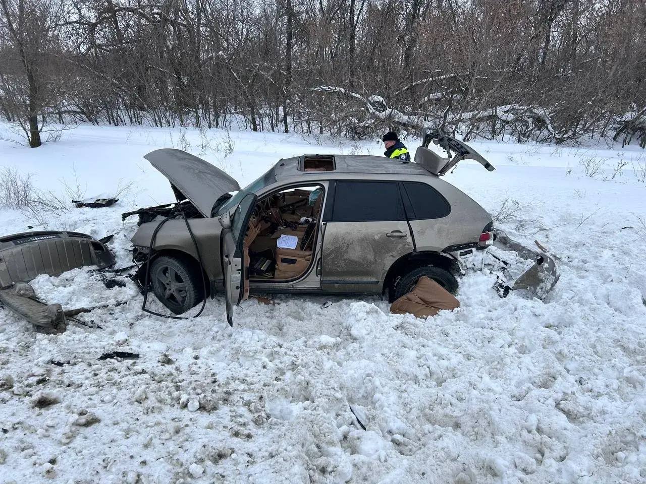 На 45 км автодороги Оренбург-Илек столкнулись Porsche и Hyundai Solaris. Судя по фото, удар был очень мощным — одну иномарку выбросило в кювет, вторую развернуло на полосе.