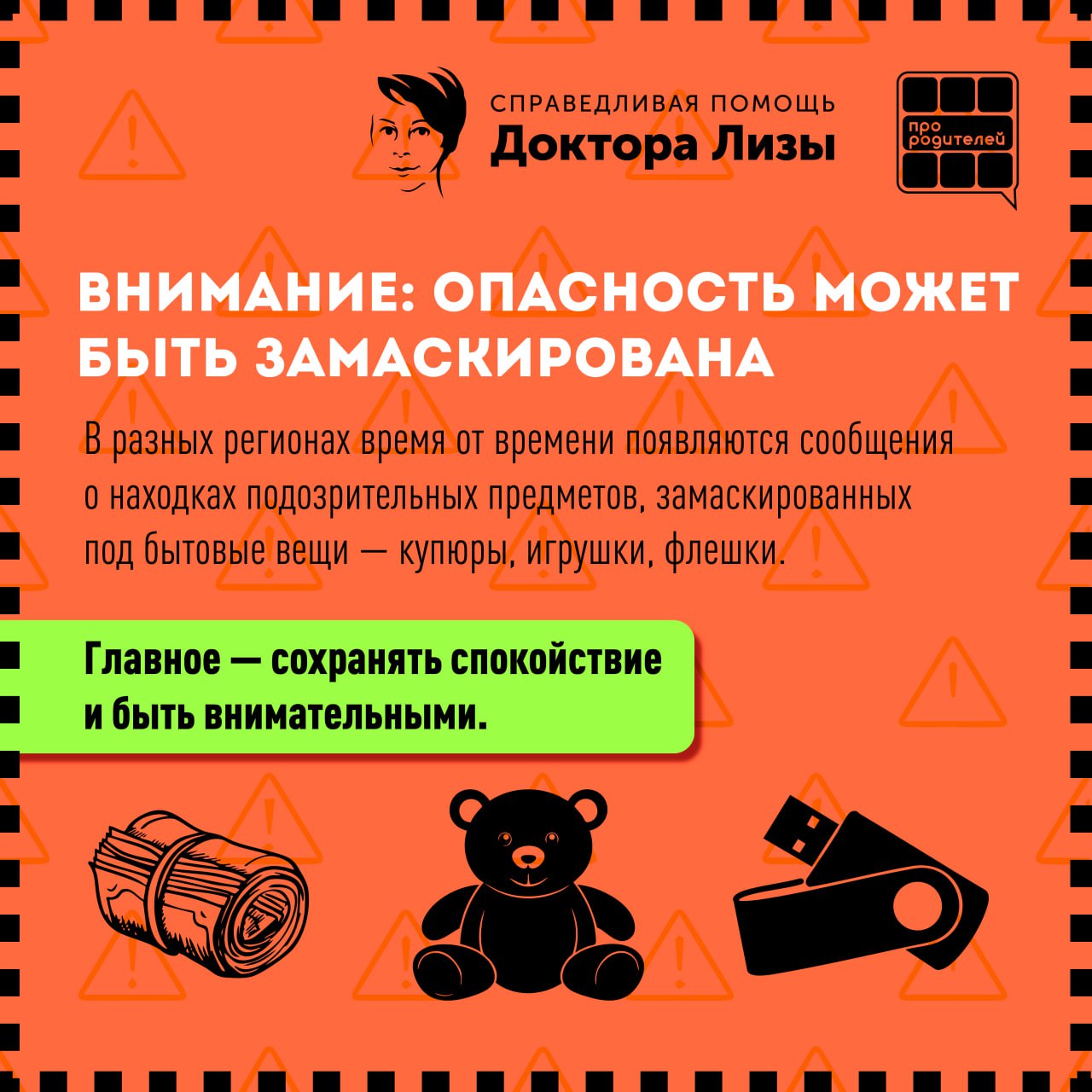 Специалисты подготовили информацию для родителей и детей — как распознать опасность, не поддаваться любопытству и действовать спокойно и правильно. Покажите эти карточки ребёнку, обсудите вместе и напомните простое правило: если не уверен — не трогай.