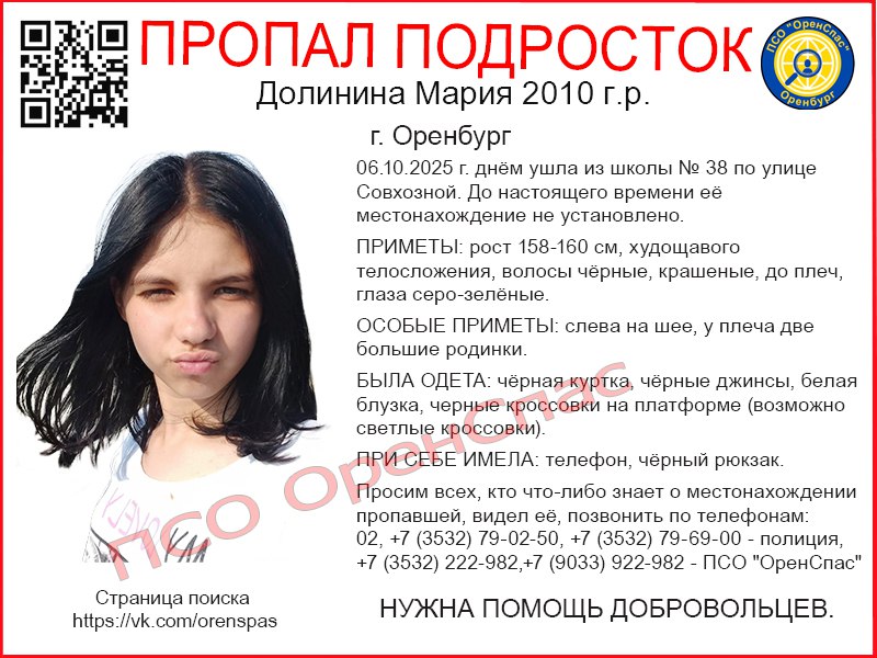 — Просим всех, кто что-либо знает о местонахождении пропавшей, видел её, позвонить по телефонам: 02, +7 (3532) 79-02-50, +7 (3532) 79-69-00 — полиция, +7 (3532) 222-982, +7 (9033) 922-982, — обращаются в ПСО «ОренСпас».