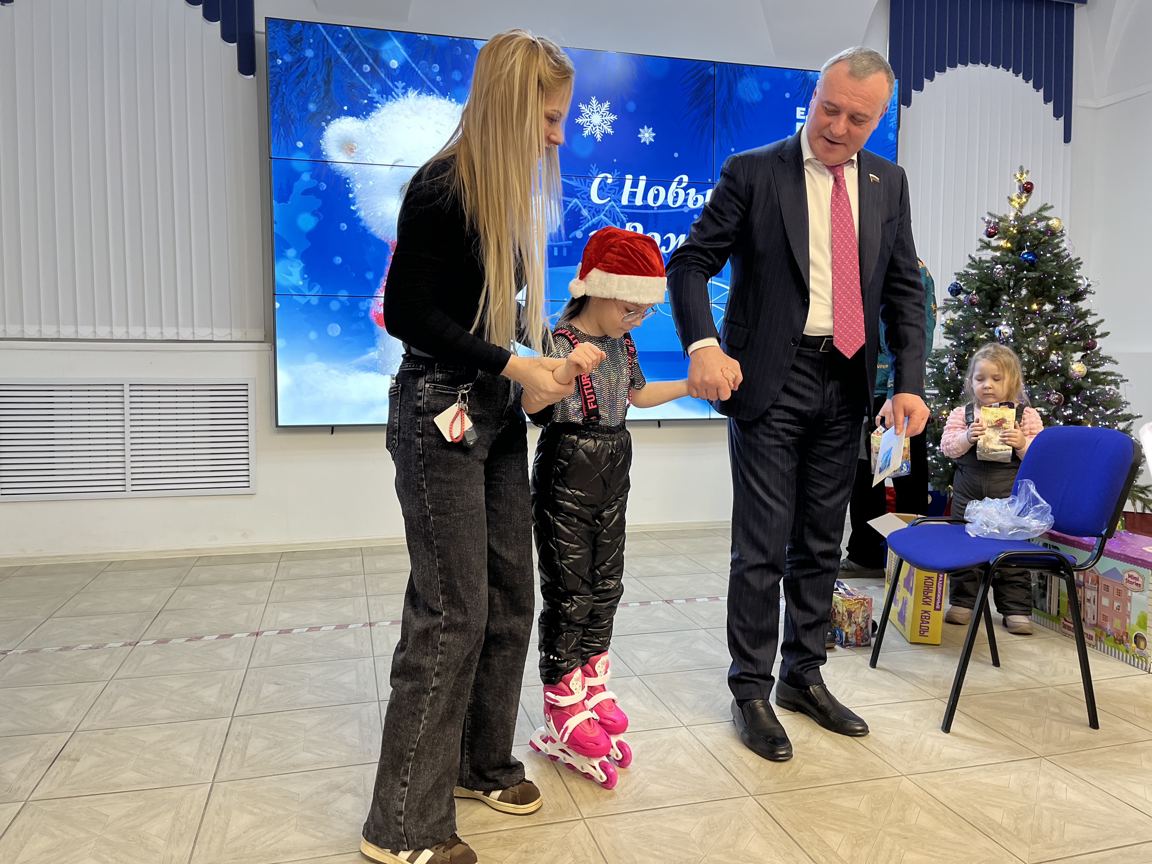 Накануне Нового года они вместе с мамой Викторией приехали на встречу с депутатом в Штаб общественной поддержки «Единой России». Здесь Олег Димов вручил им заветные подарки: Полине — кукольный дом, Софии — роликовые коньки, которые могут с легкость трансформироваться и для катания по льду, а Михаилу — игровые наушники.