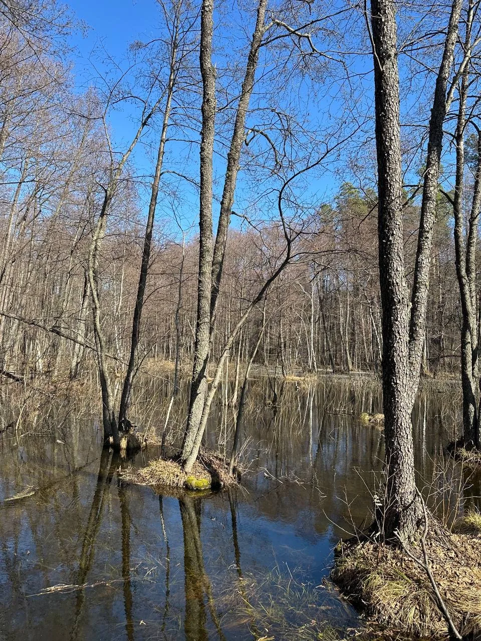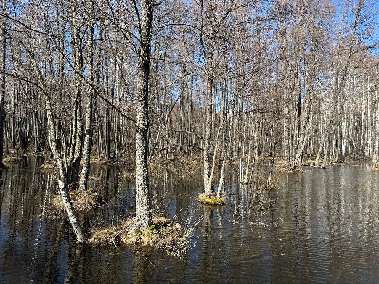 В «Царь-бору» вовсю кипит жизнь в «кобелах» — это те самые ольховые кочки на корнях-ходулях. Ондатры устроили здесь настоящие крепости.