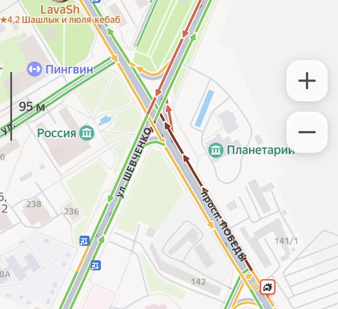 -Проспект Победы — тут сегодня ДТП у «Кометы», так что хвост от Орской до Рыбаковской.