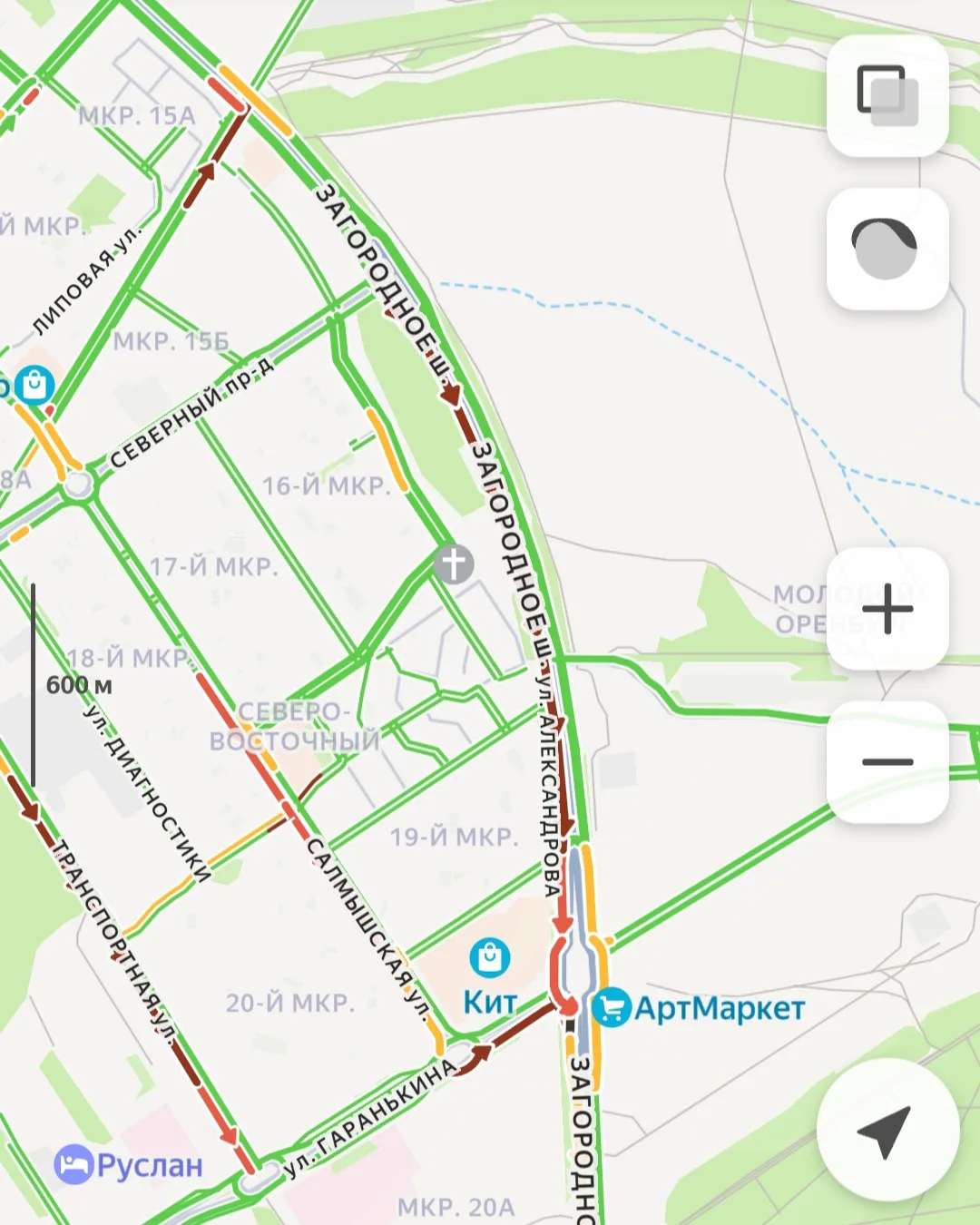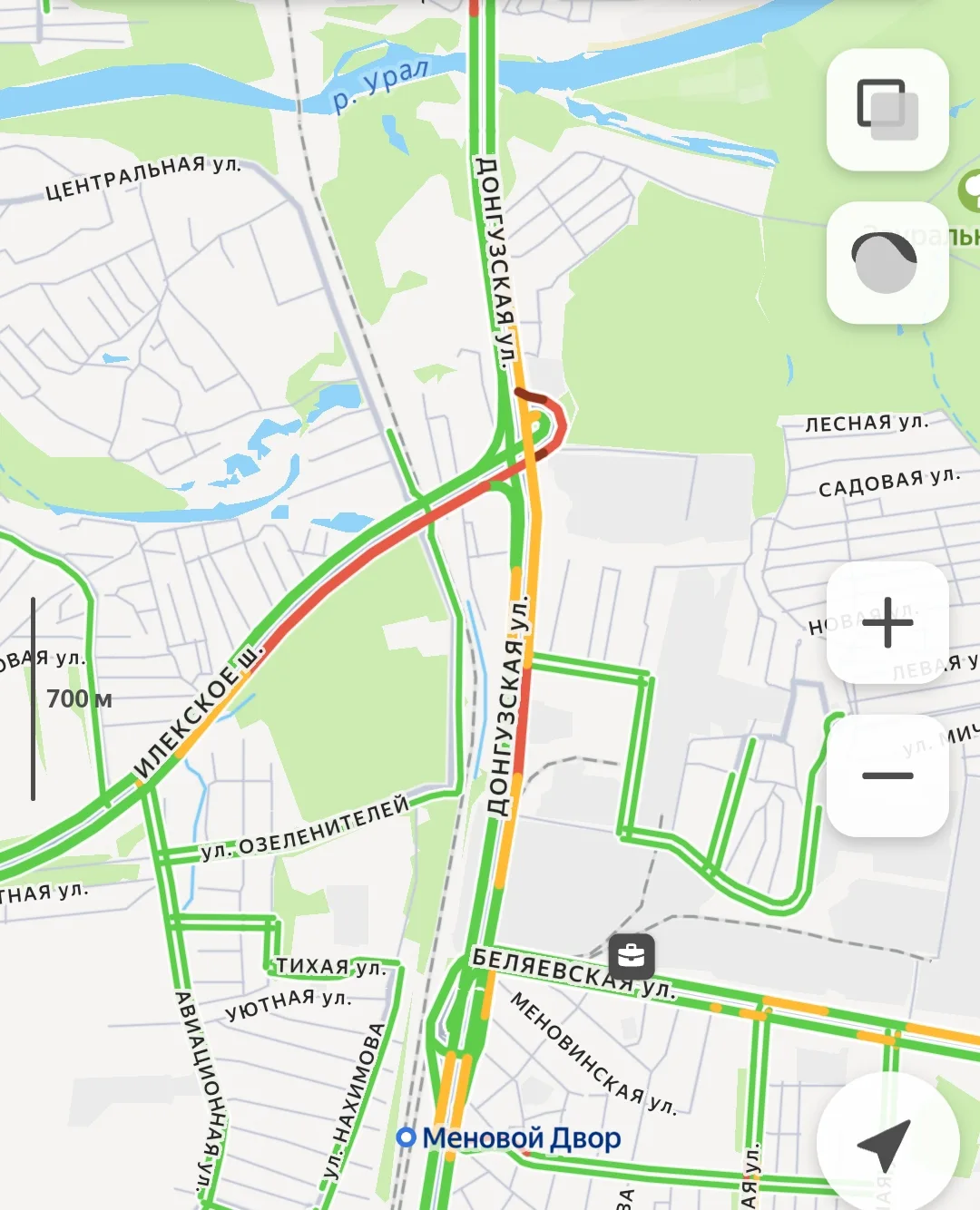 -Донгузская и Илекское шоссе: Традиционный «красный» коллапс на въезде в город со стороны Южного. Пробка растянулась от путепровода через железную дорогу до самой развязки на Донгузской.