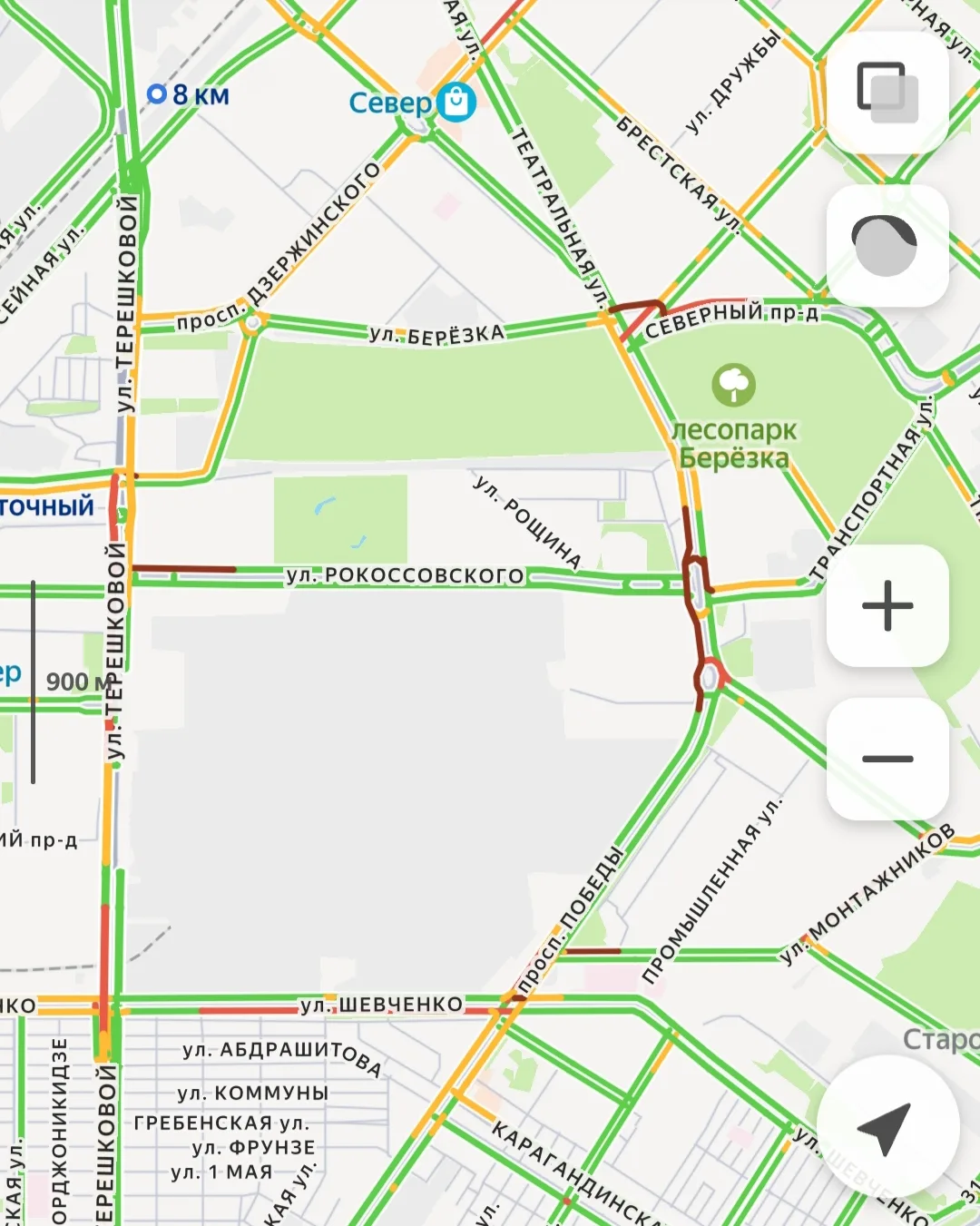 -Проспект Победы: Затор растянулся от ул. Степана Разина до ул. Маршала Жукова. Скорость движения не превышает 10-15 км/ч.