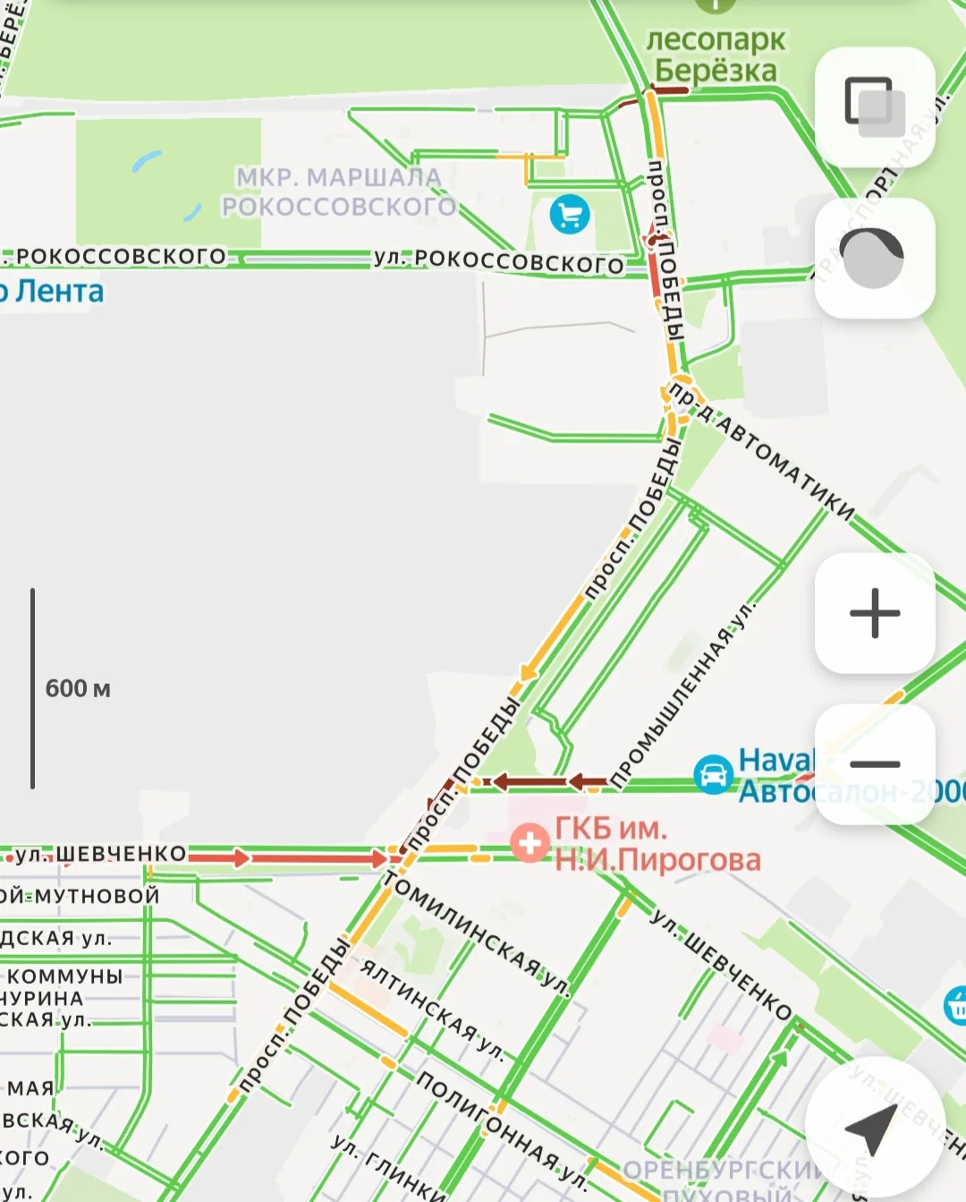 -Пр. Победы: движение серьезно затруднено. Основные заторы фиксируются от ул. Рокоссовского до ул. Маршала Жукова.