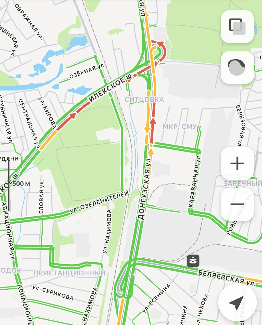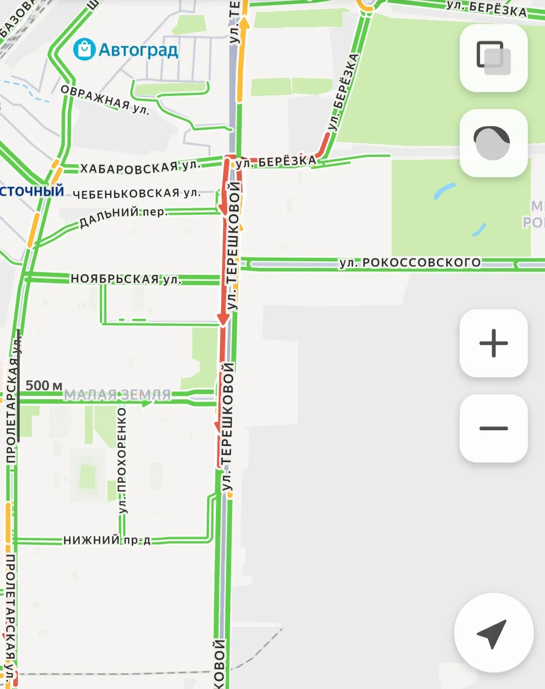 -Ул. Терешковой: «бордовая» зона в сторону центра — закладывайте лишнее время на дорогу.
