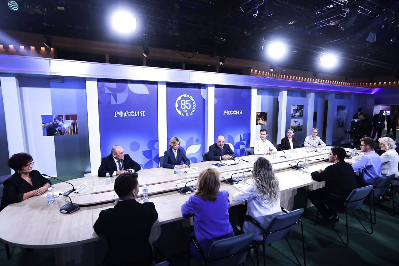 Михаил Мишустин пообщался с победителями чемпионатов профмастерства, студентами и директорами кластеров проекта «Профессионалитет» в Национальном центре «Россия». Преподаватель Оренбургского гуманитарно-технического техникума Артур Явгастин тоже стал участником общения.