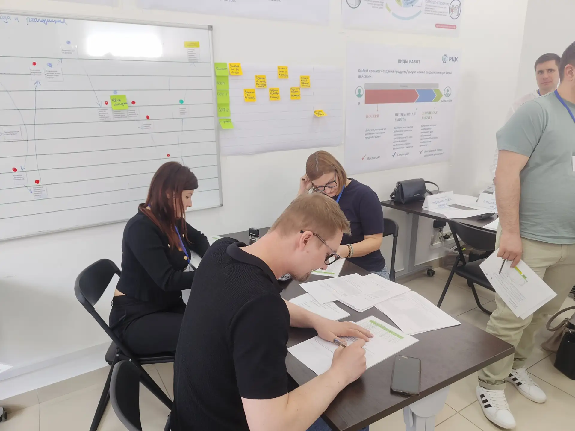 Участники тренинга в рамках командной работы анализируют существующий процесс, предлагают улучшения, тестируют гипотезы и внедряют изменения.