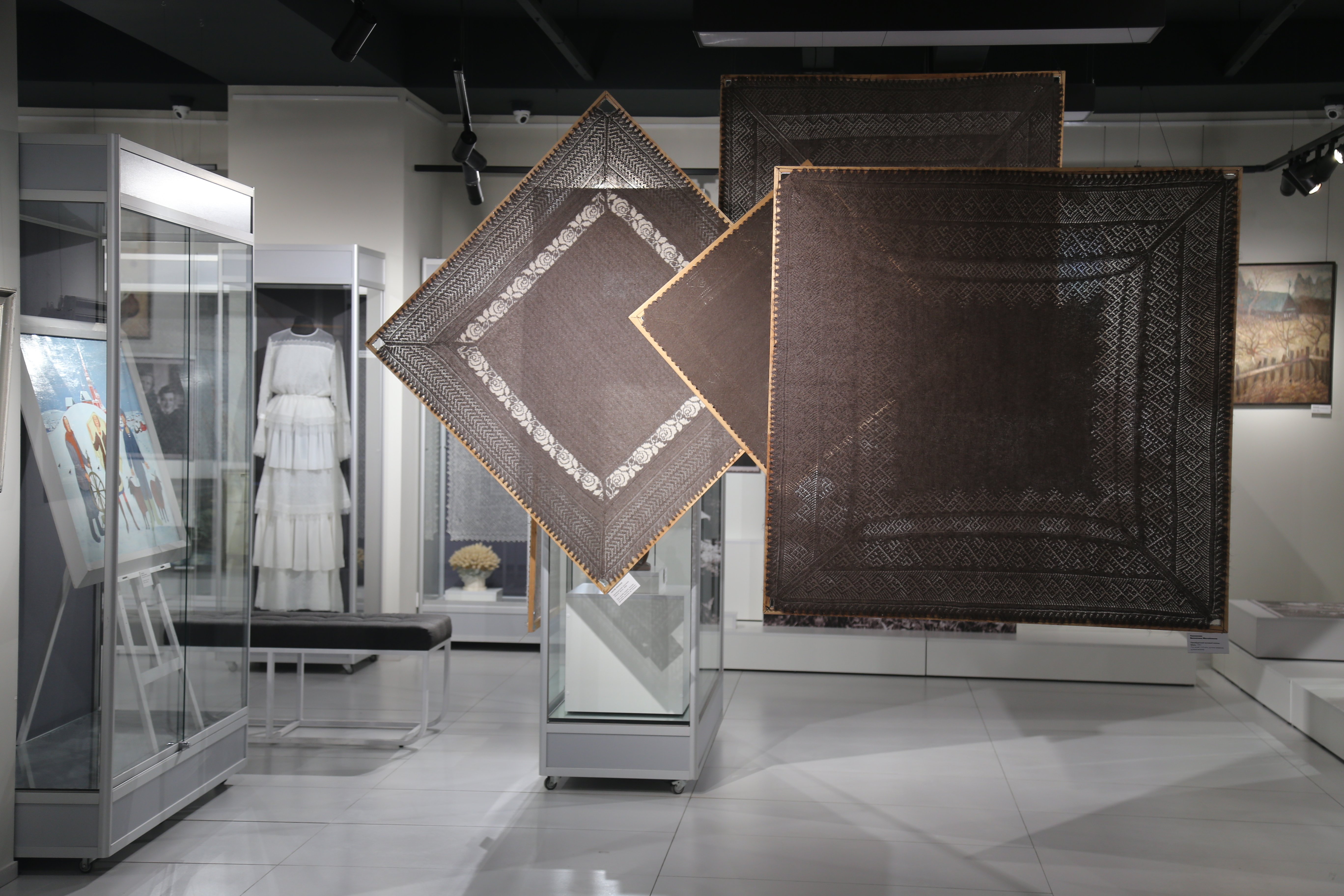 В одной экспозиции и малоизвестные «катетки» — это небольшие платочки для детей, и тончайшие паутинки, и основательные пуховые платки.