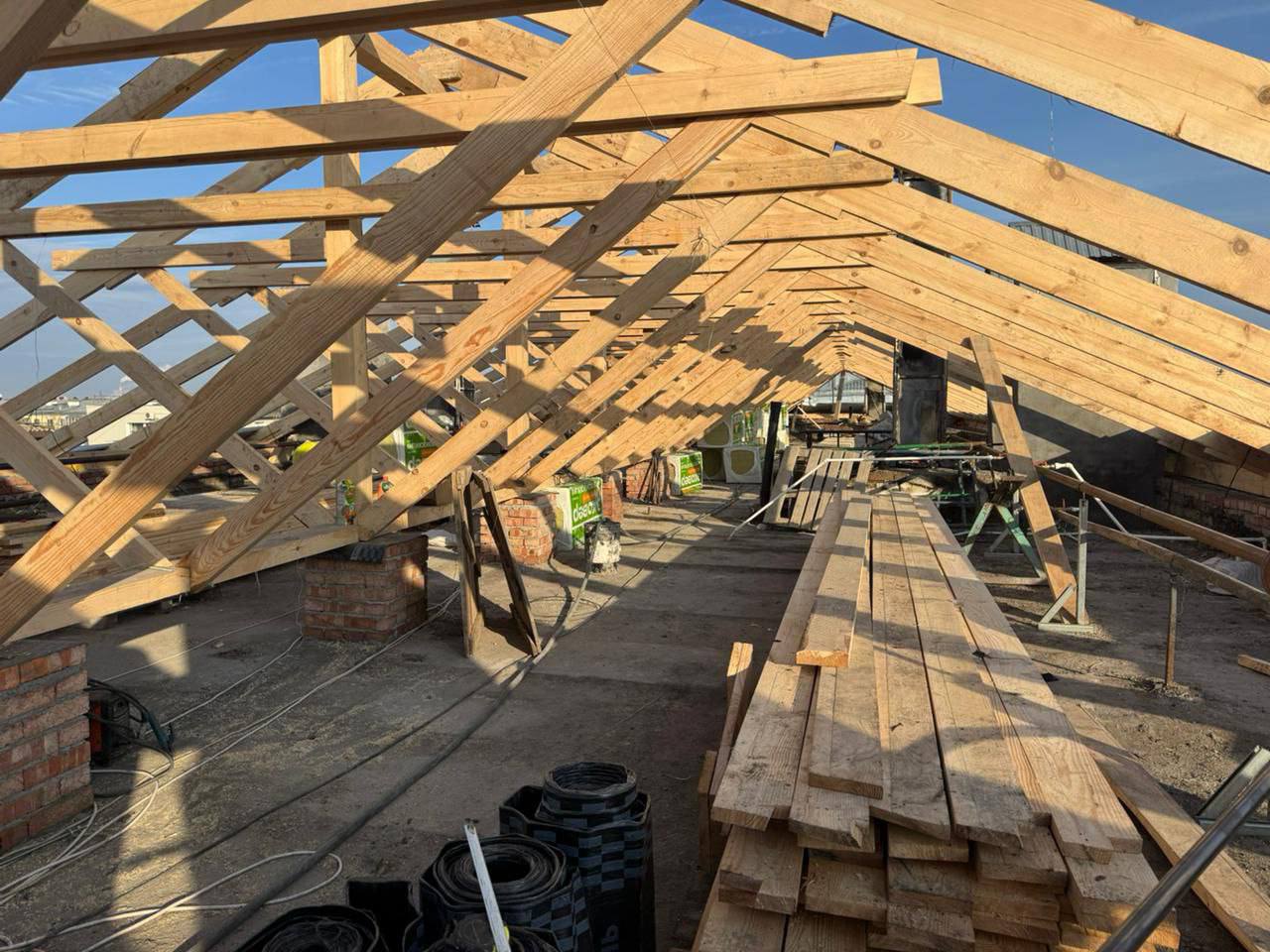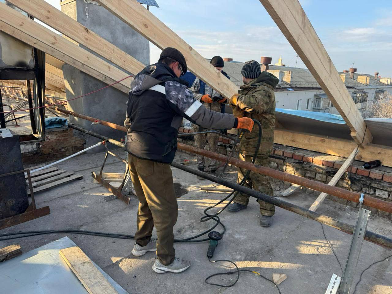 На текущий момент рабочие полностью выложили парапет, стропильная конструкция сооружена на две трети, а также практически завершены работы по замене магистрали центрального отопления.