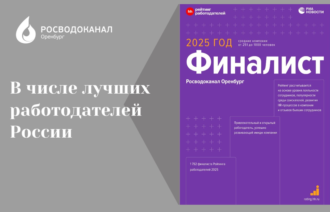 Росводоканал Оренбург вошел в число финалистов авторитетного рейтинга работодателей HeadHunter-2025 (hh.ru), получив статус «Финалист». Компания признана привлекательным и открытым работодателем, успешно развивающим свой HR-имидж на рынке труда. Из предприятий группы компаний «Росводоканал» в рейтинг вошли три работодателя, в числе которых Росводоканал Оренбург.
