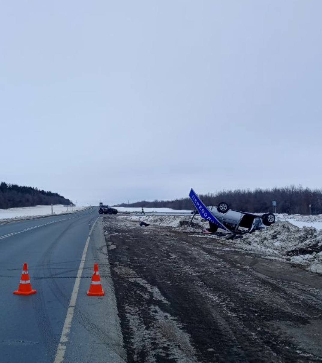 В результате указатель был снесён, а сама машина вылетела в кювет и перевернулась на крышу.