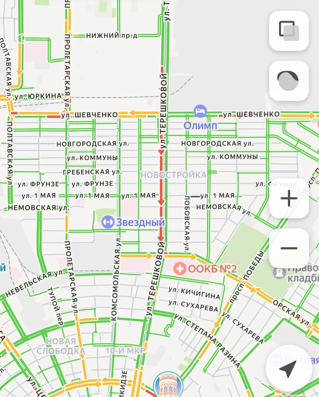 -Ул. Терешковой: Традиционная пробка в районе пересечения с улицей Шевченко из-за сужения потока и плотного трафика с прилегающих улиц