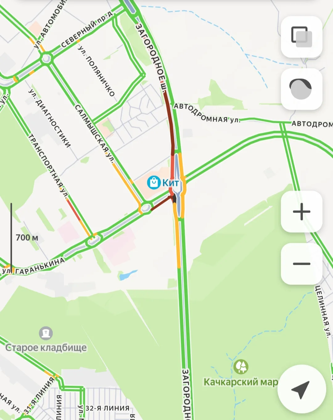 -Загородное шоссе: Традиционный затор в районе кольца с улицей Гаранькина и на пересечении с проездом Северным. Движение затруднено в обе стороны.