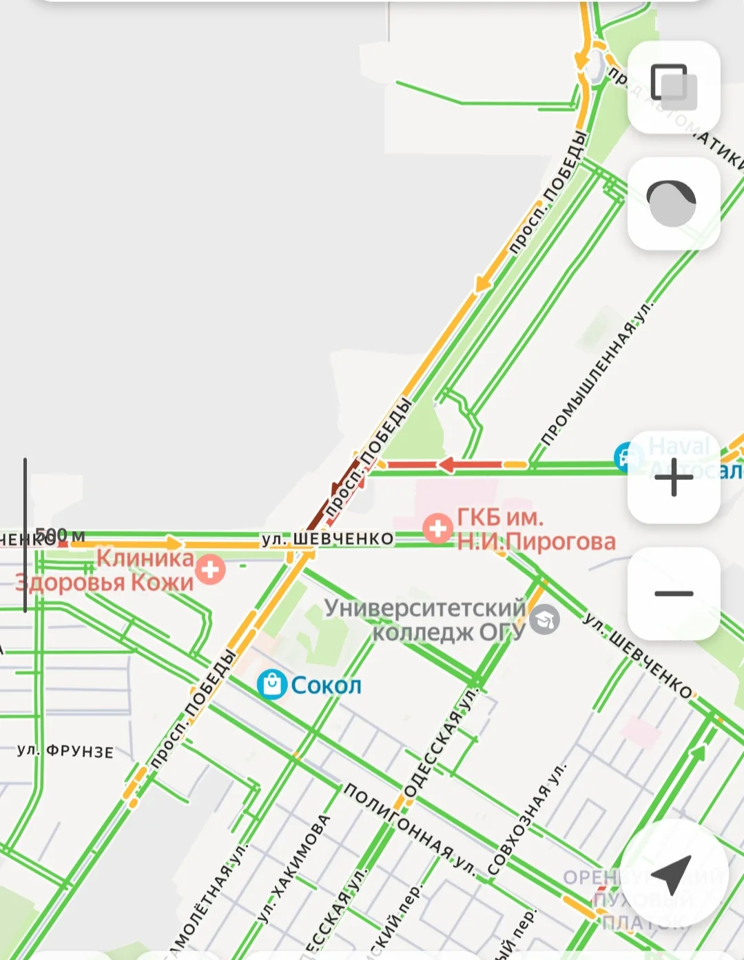 -Проспект Победы: Плотный поток от улицы Монтажников до проспекта Автоматики. Скорость движения на отдельных участках не превышает 15–20 км/ч.