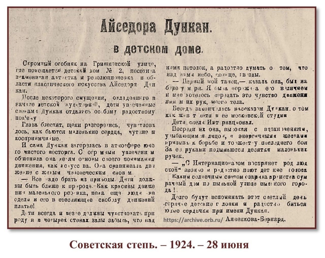 Сам Сергей Александрович Есенин в Оренбурге не был. Но в нашем городе в 1924 году гастролировала его тогда уже бывшая супруга – известная американская танцовщица Айседора Дункан. Это было в 1924 года. Заметку опубликовала газета «Советская степь», сообщили в Госархиве региона. Дункан посетила детский дом и как говорят сегодня провела мастер-класс. И танцевала для юных оренбуржцев.