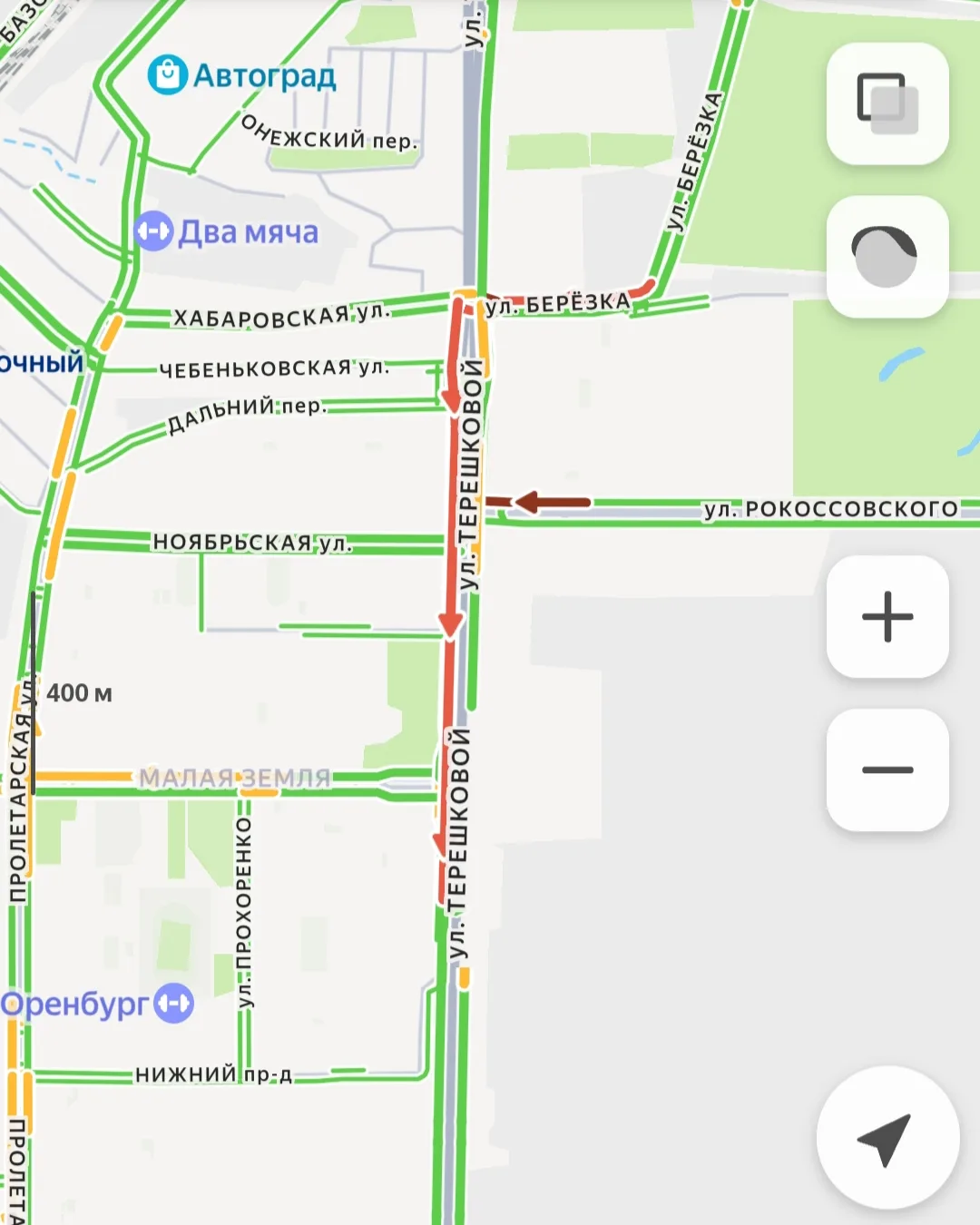 -Улица Терешковой: плотный поток от ул. Орской до Рыбаковской. Скорость движения не превышает 10-15 км/ч.