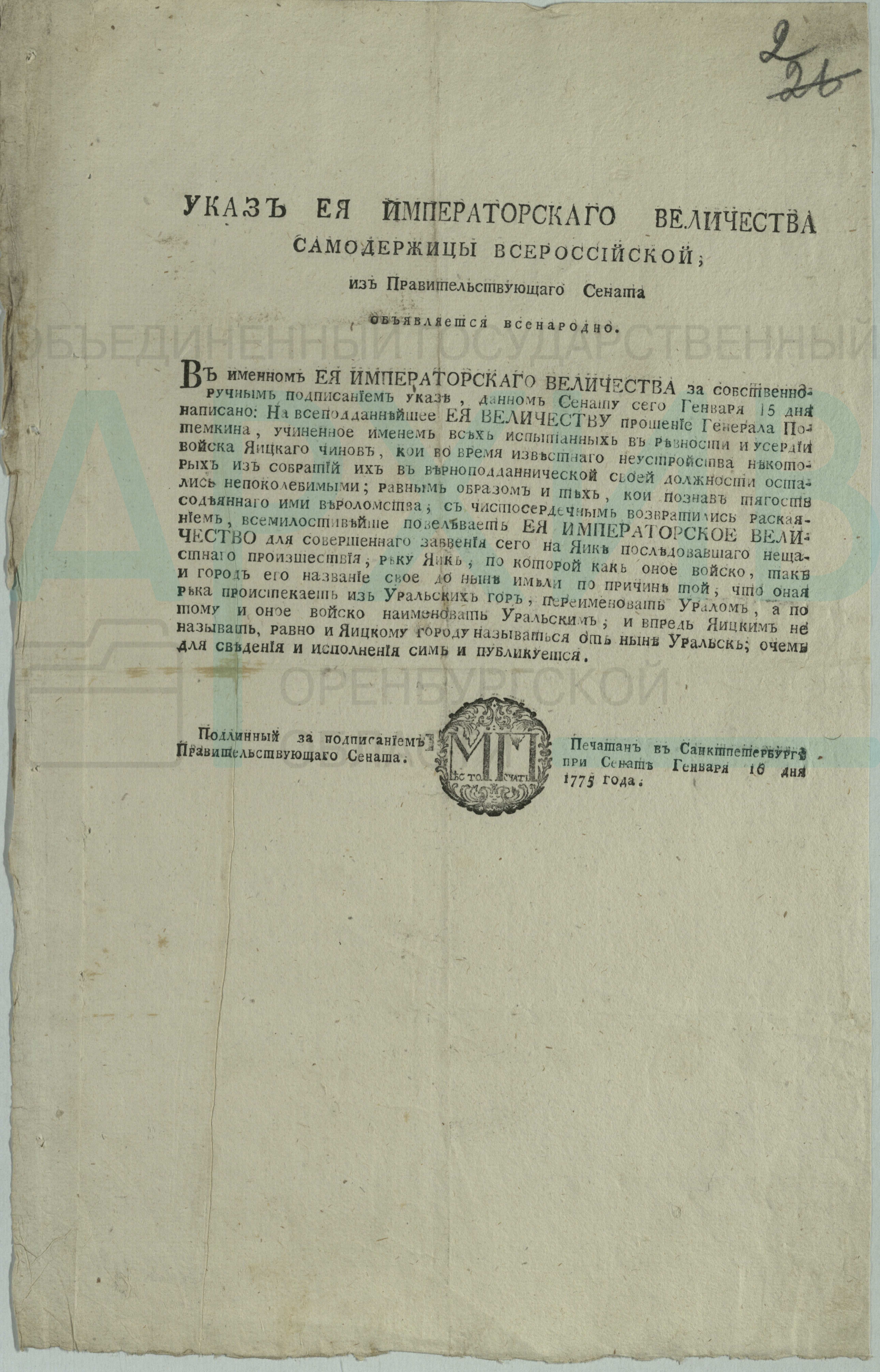 — «Для совершенного забвения, последовавшего на Яике несчастного происшествия», — цитирует указ императрицы Госархив Оренбуржья.
