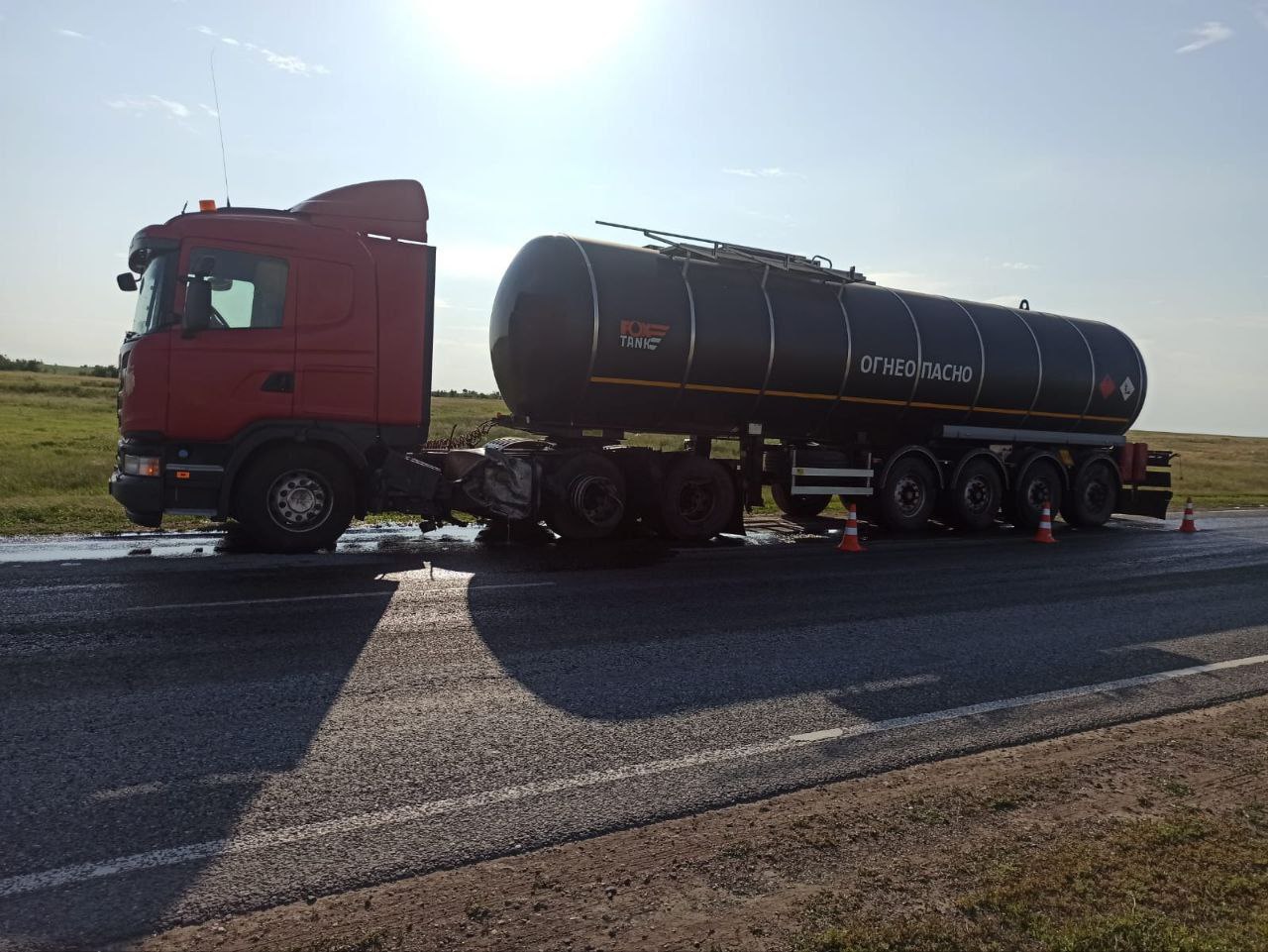 Недалеко от села Белозерка столкнулись бензовоз Scania и автомобиль Geely MK. От удара легковушку выбросило в кювет с переворотом.