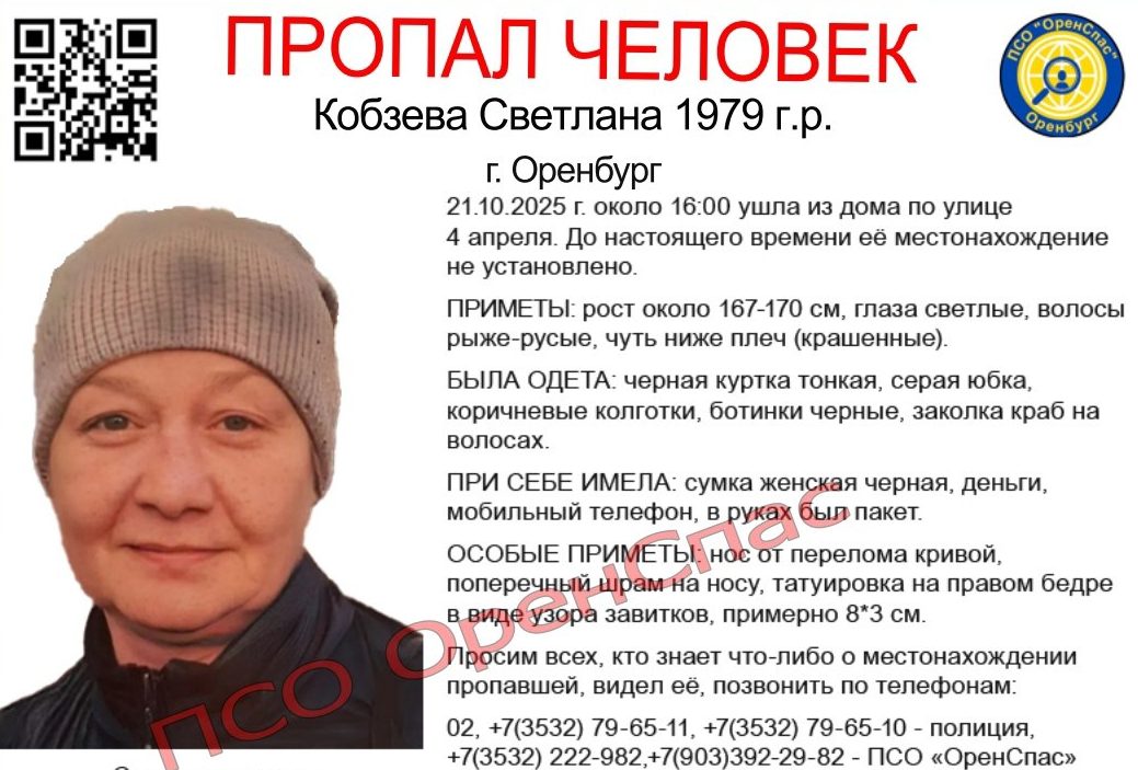 Всех, кто знает что-либо о местонахождении пропавшей, видел её, просят позвонить по телефонам: 02, +7 (3532) 79-65-11, +7 (3532) 79-65-10 — полиция, +7 (3532) 222-982, +7 (903) 392-29-82 — ПСО «ОренСпас».
