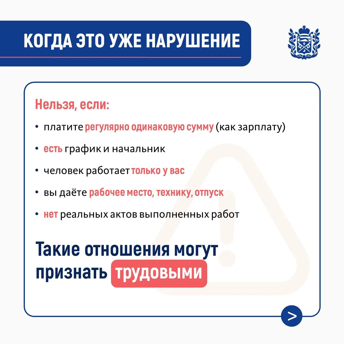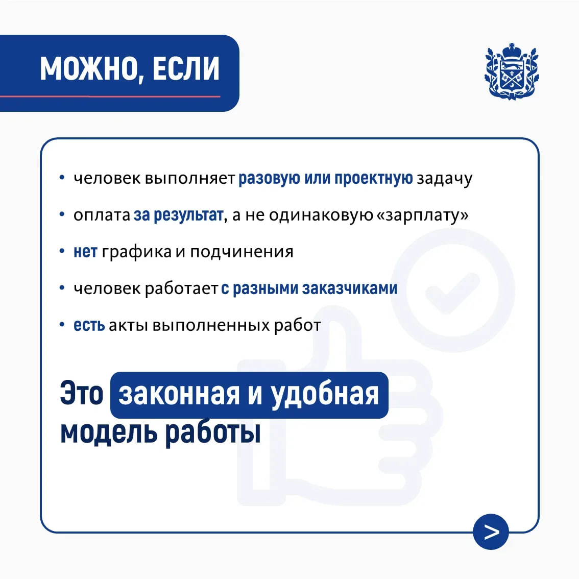 При этом самозанятость сама по себе — хороший и законный инструмент, если использовать ее правильно: платить за конкретные задачи, без жесткой привязки к графику и без признаков трудовых отношений.