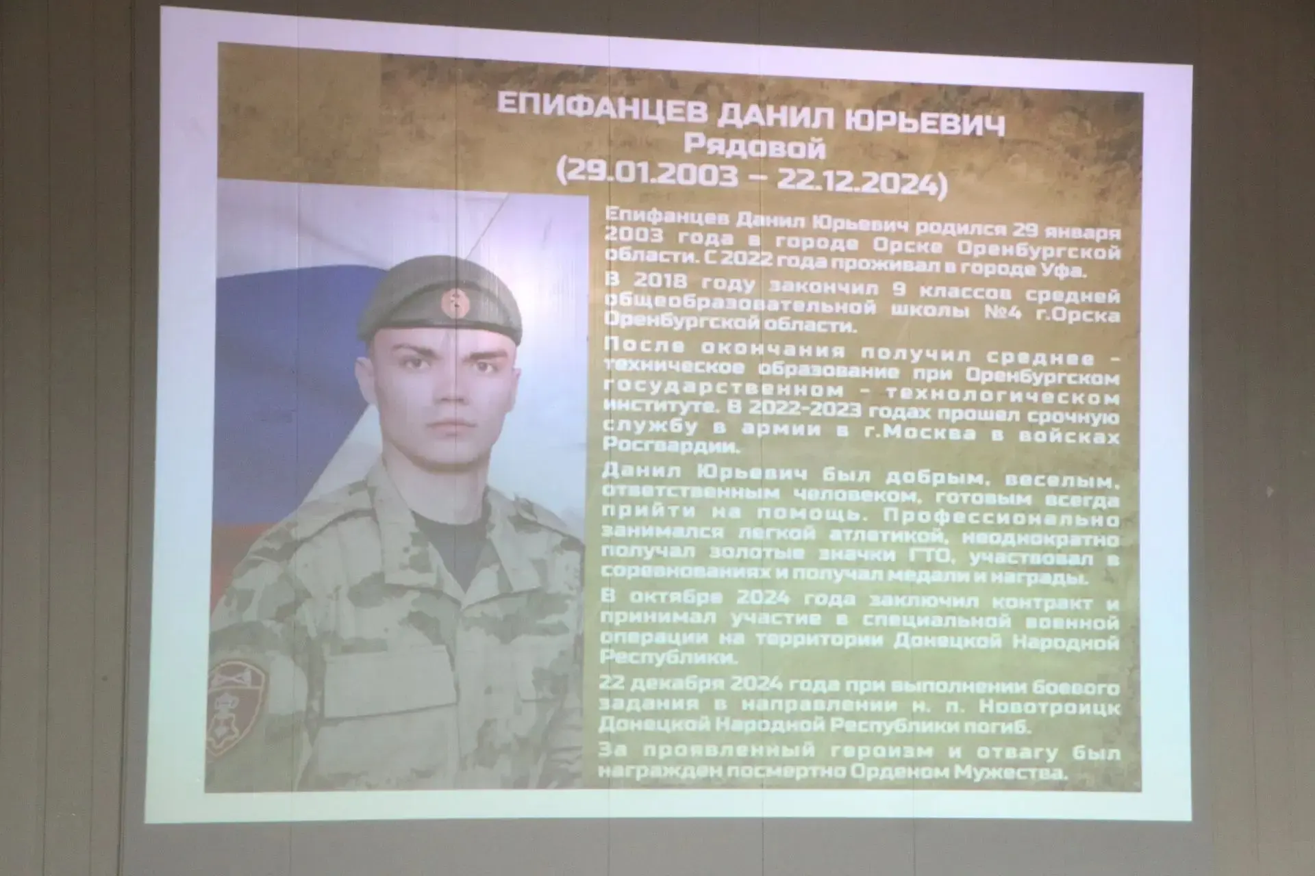 Сын – Данила Юрьевич Епифанцев героически воевал и погиб в декабре 2024 года под Успеновкой. Ему был 21 год. Парту Героя открыли в школе № 4, в которой юноша учился.