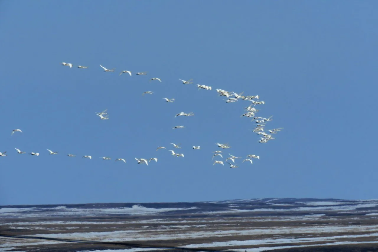 -В небе шумят стаи лебедей и гусей, поют жаворонки и курлыкают журавли.
