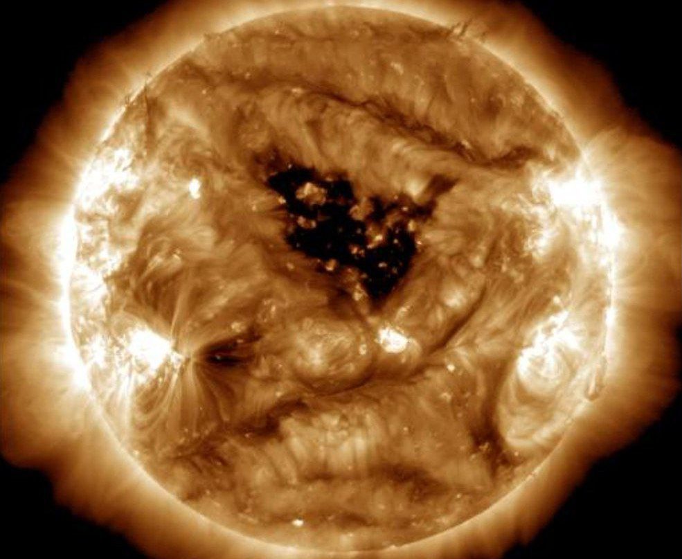 Облако заряженных частиц достигнет Земли уже завтра. Данный «паровозик» из пятен, благодаря своим размерам, можно увидеть невооружённым взглядом. Но только через специальные фильтры. Из подручных средств подойдёт, например, сварочная маска.
