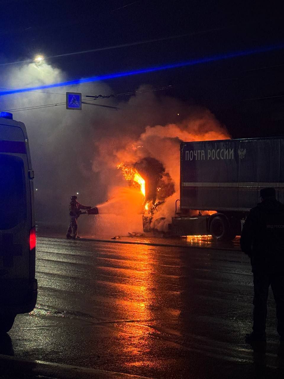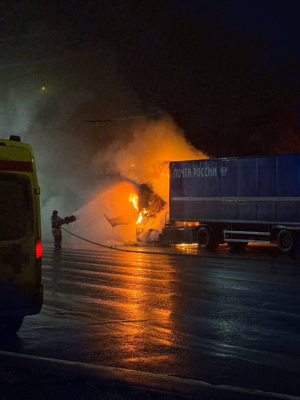 Судя по маркировке — машина «Почты России». Возгорание произошло в кабине водителя. Огонь полыхал и мог охватить весь грузовик.