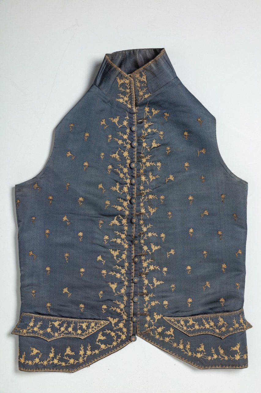 Зеленый и синий жилеты идентичны. Они оба изготовлены в Западной Европе примерно в одно и тоже время и по одним лекалам. Для их создания использован благородный шелк, пуговицы обтянуты тканью, и расшиты они блестками и цветной фольгой — так в XVIII столетии заменяли драгоценные камни в отделке костюмов.
