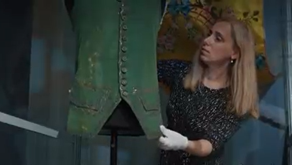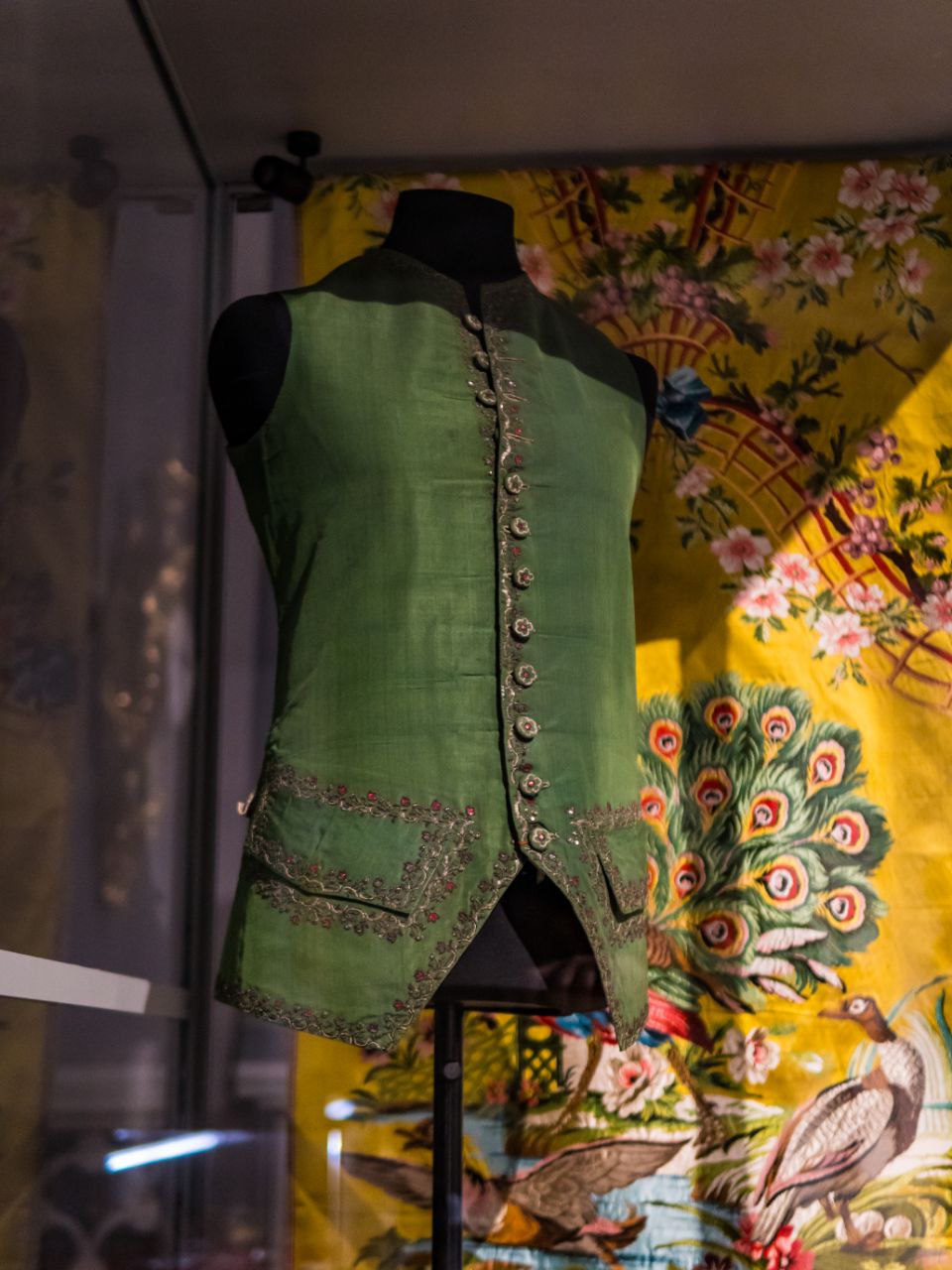 Речь идет о шелковом жилете XVIII в., который был заменен на шелковый жилет этого же столетия. Все дело в том, что историческую одежду нельзя выставлять больше 4,5 месяцев, чтобы ткань не выцветала. Существуют неукоснительные правила, по которым исторические ткани требуют к себе особого внимания: манекен, на котором выставлен экспонат, должен быть идеально подобран по размеру; соблюдается влажность, определенная температура воздуха и отсутствие прямого света. Сюда же относится и время выставления предмета экспозиции.
