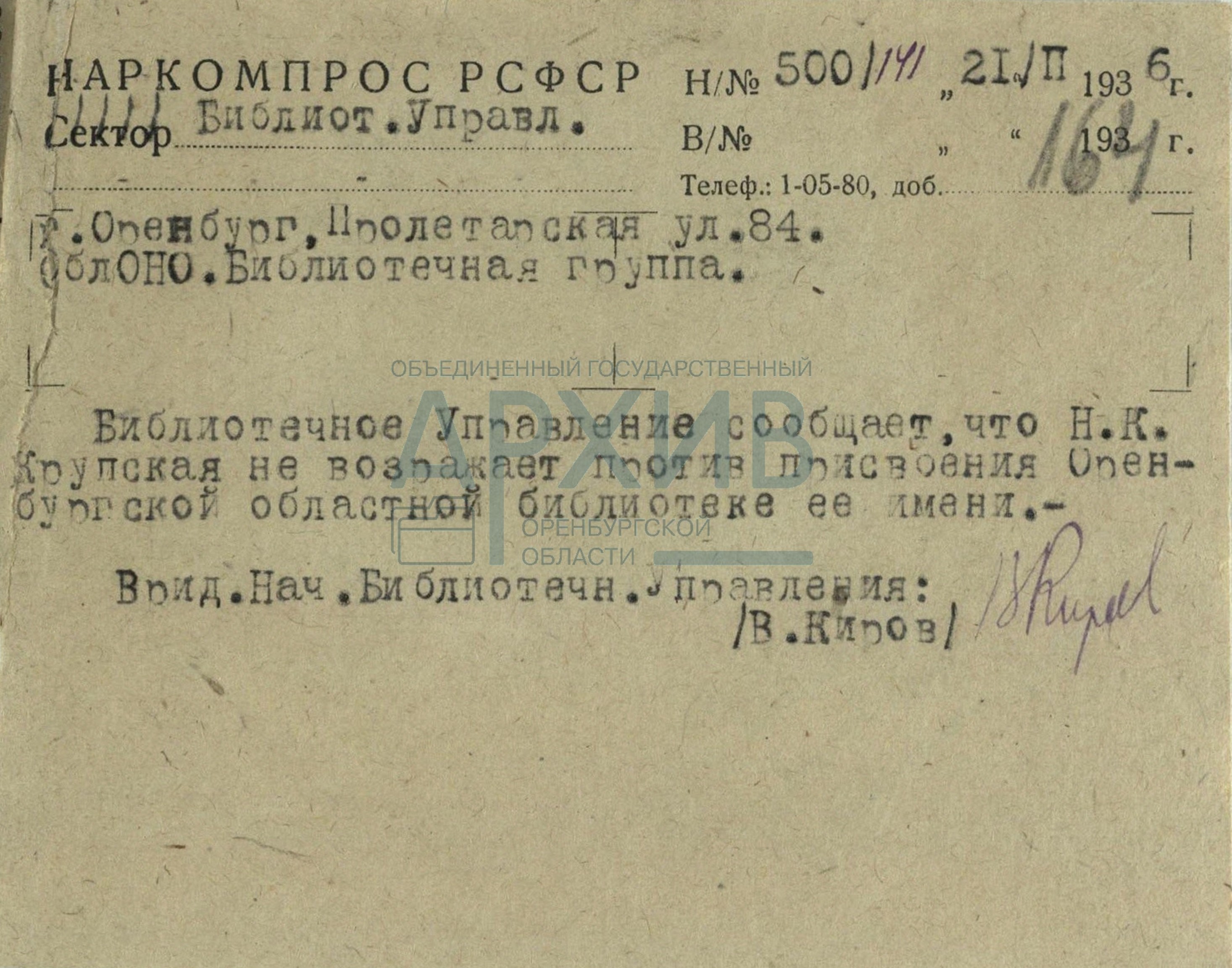Его публикует Государственный архив Оренбургский области. Надежда Константиновна 21 февраля 1936 года дает свое согласие на присвоение имени Крупской областной библиотеке Оренбуржья.