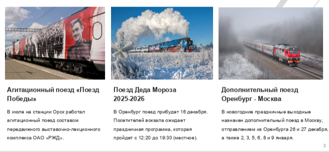 Набрали популярность туристские маршруты. Это поезд Победы, поезд Деда Мороза. Весной тематический поезд к юбилею первого космического полёта Юрия Гагарина проедет от Москвы через Самару и Оренбург в Саранск. Маршрут получил название «Космические выходные». Такие событийные проекты тоже важны, и мы стараемся, чтобы их было больше,- рассказал Селецкий.